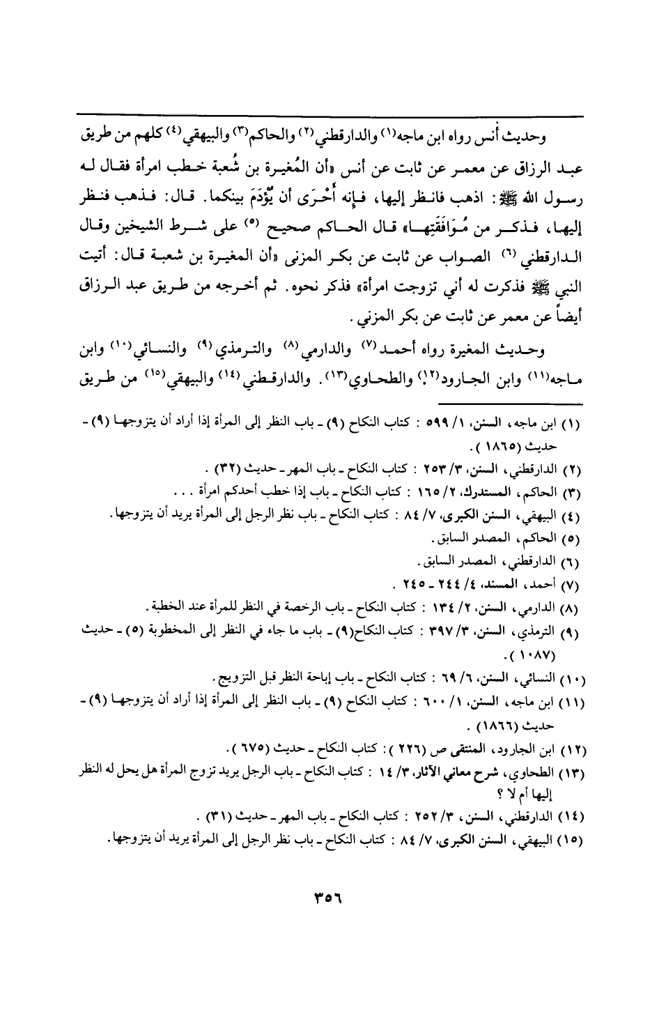 وحديث أنس رواه ابن ماجه والدارقطني والحاكم والبيهقي كلهم من طريق عبد الرزاق عن معمر عن ثابت عن أنس "أن المُغيرة بن شُعبة خطب امرأة فقال له رسول الله - صلى الله عليه وسلم -: اذهب فانظر إليها، فإِنه أَحرَى أن يُؤْدَمَ بينكما. قال: فذهب فنظر إليها، فذكر من مُوَافَقَتِها" قال الحاكم صحيح على شرط الشيخين وقال الدارقطني الصواب عن ثابت عن بكر المزنى "أن المغيرة بن شعبة قال: أتيت النبي - صلى الله عليه وسلم - فذكرت له أني تزوجت امرأة" فذكر نحوه. ثم أخرجه من طريق عبد الرزاق أيضًا عن معمر عن ثابت عن بكر المزني.