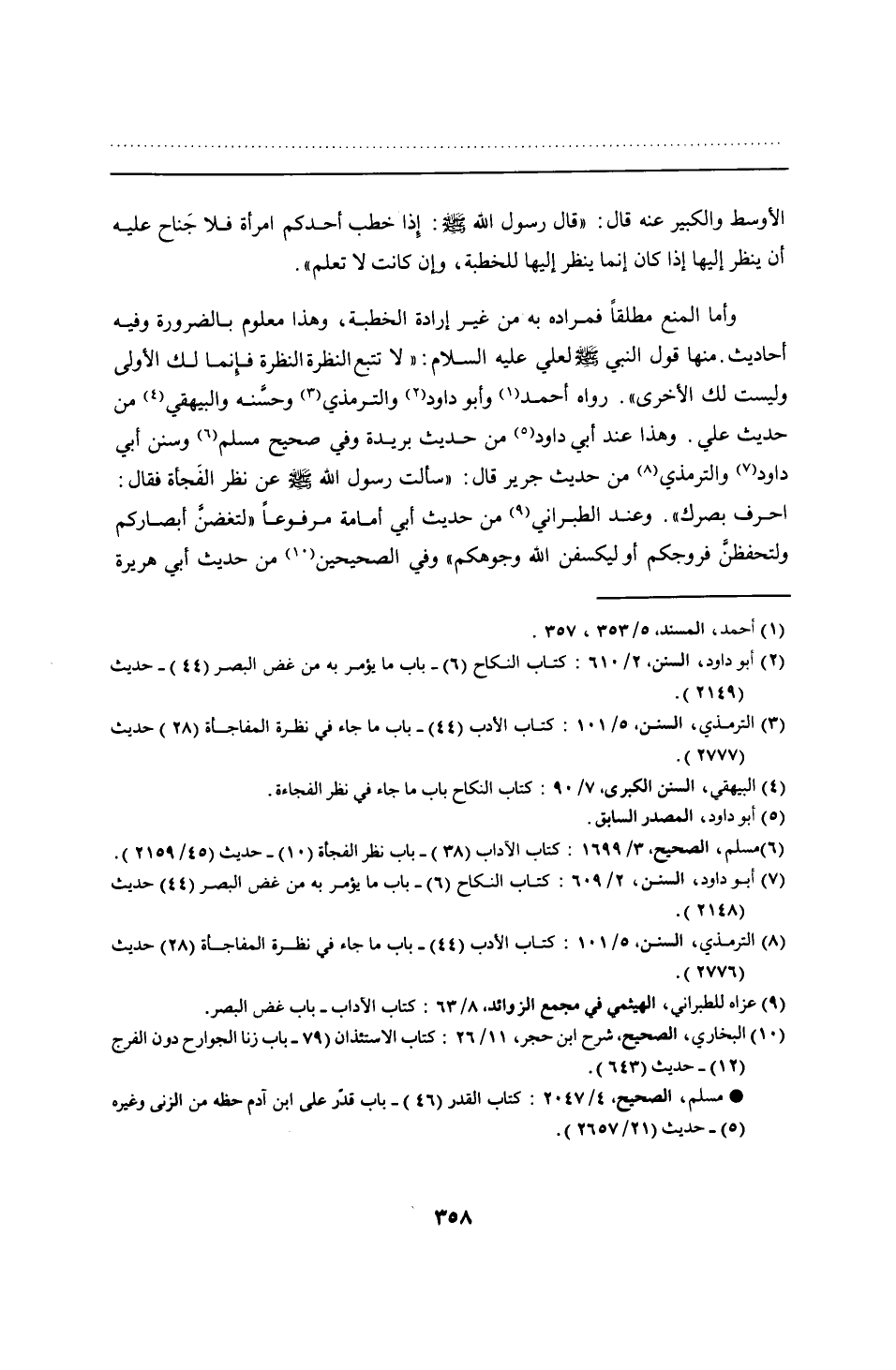 وأما المنع مطلقًا فمراده به من غير إرادة الخطبة، وهذا معلوم بالضرورة وفيه أحاديث. منها قول النبي - صلى الله عليه وسلم - لعلي -عليه السلام-: "لا تتبع النظرة النظرة فإِنما لك الأولى وليست لك الأخرى". رواه أحمد وأبو داود والترمذي وحسَّنه والبيهقي من حديث علي. وهذا عند أبي داود من حديث بريدة وفي صحيح مسلم وسنن أبي داود والترمذي من حديث جرير قال: "سألت رسول الله - صلى الله عليه وسلم - عن نظر الفَجأة فقال: احرف بصرك". وعند الطبراني من حديث أبي أمام مرفوعًا "لتغضنَّ أبصاركم ولتحفظنَّ فروجكم أو ليكسفن الله وجوهكم" وفي الصحيحين من حديث أبي هريرة