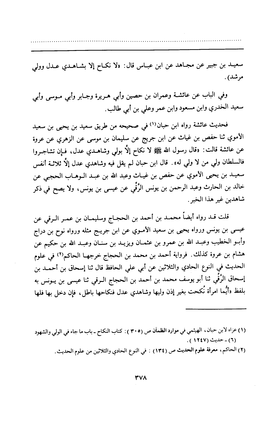 فحديث عائشة رواه ابن حبان في صحيحه من طريق سعيد بن يحيي بن سعيد الأموي ثنا حفص بن غياث عن ابن جريج عن سليمان بن موسى عن الزهري عن عروة عن عائشة قالت: "قال رسول الله - صلى الله عليه وسلم - لا نكاح إلَّا بولي وشاهدي عدل، فإِن تشاجروا فالسلطان ولي من لا ولي له". قال ابن حبان لم يقل فيه وشاهدي عدل إلَّا ثلاثة أنفس سعيد بن يحيي الأموي عن حفص بن غياث وعبد الله بن عبد الوهاب الحجبي عن خالد بن الحارث وعبد الرحمن بن يونس الرَّقِّي عن عيسى بن يونس، ولا يصح في ذكر شاهدين غير هذا الخبر.