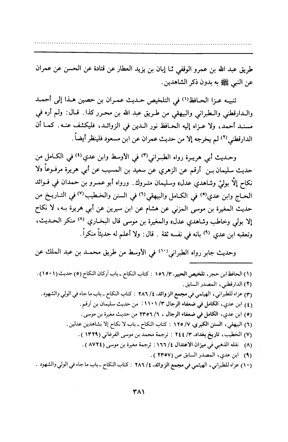 تنبيه عزا الحافظ في التلخيص حديث عمران بن حصين هذا إلى أحمد والدارقطني والطبراني والبيهقي من طريق عبد الله بن محرر كذا. قال: ولم أره في مسند أحمد، ولا عزاه إليه الحافظ نور الدين في الزوائد، فليكشف عنه. كما أن الدارقطني لم يخرجه إلا من حديث عمران عن ابن مسعود فلينظر أيضًا.