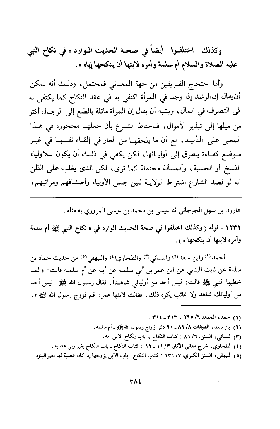 1232 - قوله (وكذلك اختلفوا في صحة الحديث الوارد في "نكاح النبي - صلى الله عليه وسلم - أم سلمة وأمره لابنها أن ينكحها").