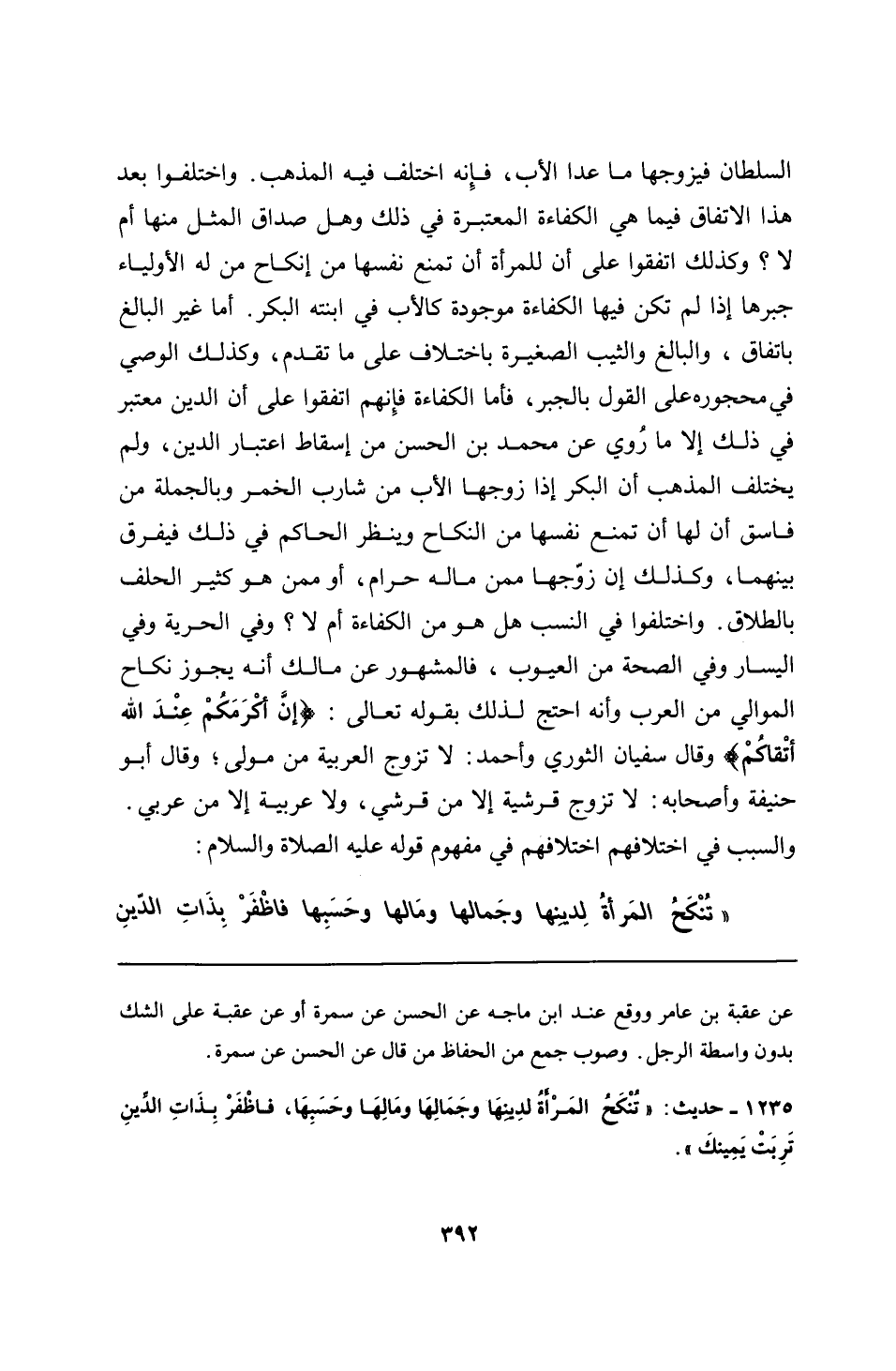 1235 - حديث: "تُنْكَحُ المَرْأَةُ لدِينِهَا وجَمَالِهَا ومَالِهَا وحَسَبِهَا، فاظْفَرْ بِذَاتِ الدِّينِ تَرِبَتْ يَمِينكَ".