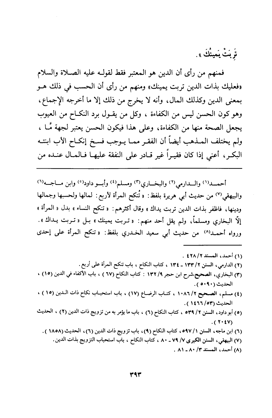 أحمد والدارمي والبخاري ومسلم وأبو داود وابن ماجه والبيهقي من حديث أبي هريرة بلفظ: "تُنكح المرأة لأربع: لمالها ولحسبها وجمالها ودينها، فاظفر بذات الدين تربت يداك" وقال أكثرهم: "تنكح النساء" بدل "المرأة" إلّا البخاري ومسلمًا، ولم يقل أحد منهم: "تربت يمينك" بل "تربت يداك". ورواه أحمد من حديث أبي سعيد الخدري بلفظ: "تنكح المرأة على إحدى