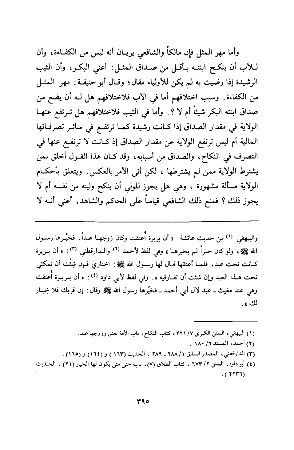 والبيهقي من حديث عائشة: "أن بريرة أُعتقت وكان زوجها عبدًا، فخيَّرها رسول الله - صلى الله عليه وسلم -، ولو كان حرًا لم يخيرها" وفي لفظ لأحمد والدارقطني: "أن بريرة كانت تحت عبد، فلما أعتقها قال لها رسول الله - صلى الله عليه وسلم -: اختاري فإن شِئْت أن تمكثي تحت هذا العبد وإن شئت أن تفارقيه". وفي لفظ لأبي داود: "أن بريرة أُعتقت وهي عند مغيث -عبد لآل أبي أحمد- فخيّرها رسول الله - صلى الله عليه وسلم - وقال: إن قربك فلا خِيار لك".