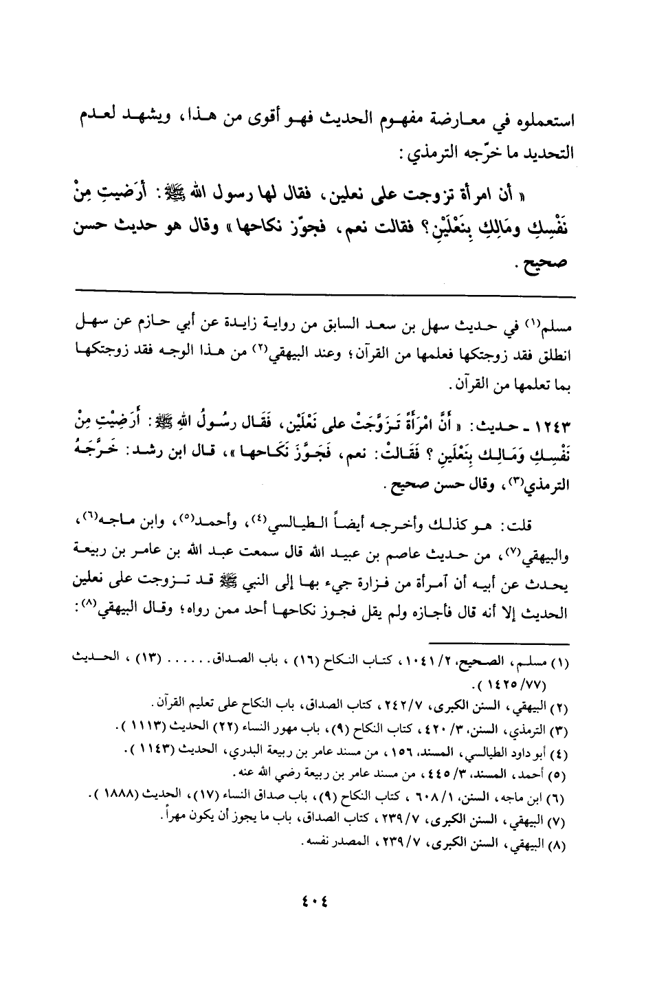 1243 - حديث: "أنَّ امْرَأةً تَزَوَّجَتْ على نَعْلَيْن، فَقَال رسُولُ اللهِ - صلى الله عليه وسلم -: أَرَضِيْتِ مِنْ نَفْسِكِ وَمَالِك بِنَعْلَينِ؟ فَقَالتْ: نعم، فَجَوَّزَ نَكَاحها"، قال ابن رشد: خَرَّجَهُ الترمذي، وقال حسن صحيح.