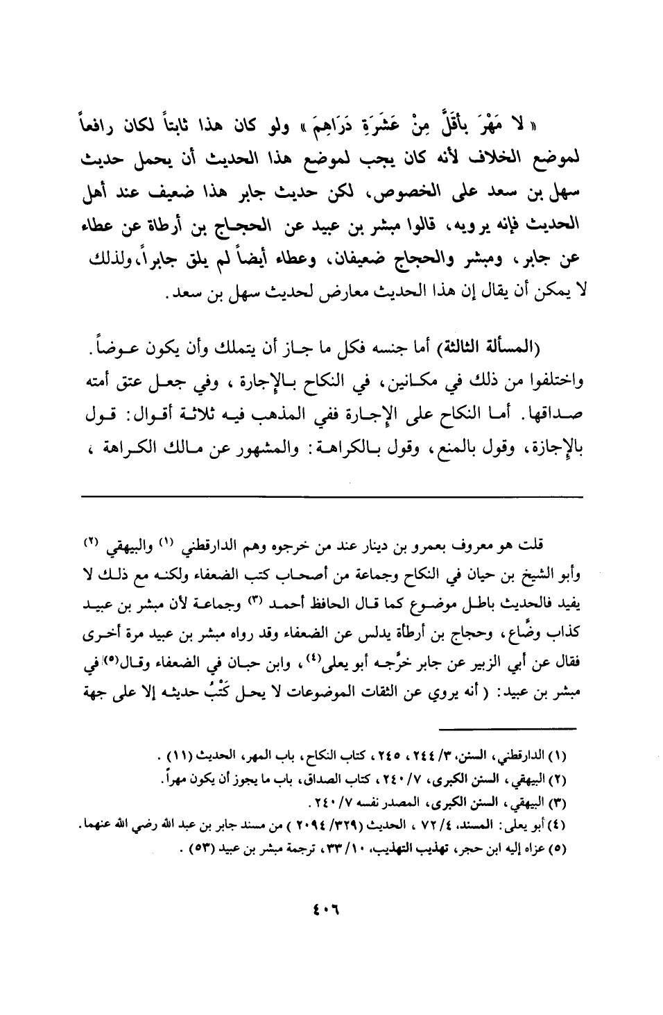 قلت هو معروف بعمرو بن دينار عند من خرجوه وهم الدارقطني والبيهقي وأبو الشيخ بن حيان في النكاح وجماعة من أصحاب كتب الضعفاء ولكنه مع ذلك لا يفيد فالحديث باطل موضوع كما قال الحافظ أحمد وجماعة لأن مبشر بن عبيد كذاب وضَّاع، وحجاج بن أرطأة يدلس عن الضعفاء وقد رواه مبشر بن عبيد مرة أخرى فقال عن أبي الزبير عن جابر خرَّجه أبو يعلى، وابن حبان في الضعفاء وقال في مبشر بن عبيد: (أنه يروي عن الثقات الموضوعات لا يحل كَتْبُ حديثه إلا على جهة
