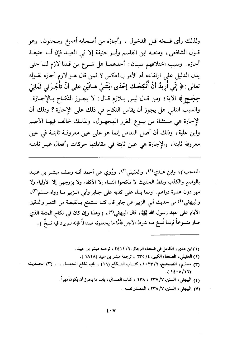 التعجب)؛ وابن عدي، والعقيلي، ورُوي عن أحمد أنه وصف مبشر بن عبيد بالوضع والكذب ولفظ الحديث لا تنكحوا النساء إلا الأكفاء ولا يزوجهن إلا الأولياء ولا مهر دون عشرة دراهم. ومما يدل على كذبه على جابر وأبي الزبير ما رواه مسلم، والبيهقي من حديث أبي الزبير عن جابر قال كنا نستمتع بالقبضة من التمر والدقيق الأيام على عهد رسول الله - صلى الله عليه وسلم -، قال البيهقي، (وهذا وإن كان في نكاح المتعة الذي صار منسوخًا فإنما نُسخ منه شرط الأجل فأمَّا ما يجعلونه صداقًا فإنه لم يرد فيه نسخٌ).