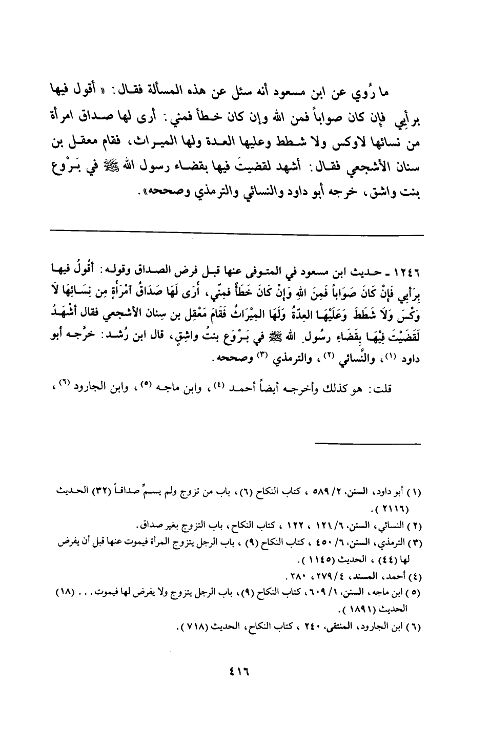 1246 - حديث ابن مسعود في المتوفى عنها قبل فرض الصداق وقوله: أقُولُ فيها بِرَأيِي فَإنْ كَانَ صَوَابًا فَمِنَ اللهِ وَإِنْ كَانَ خَطَأً فمِنّي، أرَى لَهَا صَدَاقُ امْرَأَةٍ مِن نِسَائِهَا لَا وَكْسَ وَلَا شَطَطَ وَعَلَيْهَا العِدّةُ وَلَهَا المِيْرَاثُ فَقَامَ مَعْقِل بن سِنان الأشجعي فقال أشْهَدُ لَقَضَيْتَ فِيْهَا بقَضَاءِ رسُولِ الله - صلى الله عليه وسلم - في بَرْوَع بنتُ واشِقٍ، قال ابن رُشد: خرَّجه أبو داود، والنَّسائي، والترمذي وصححه.