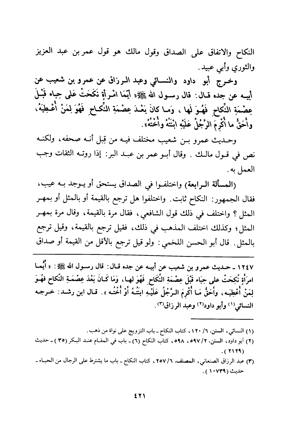 1247 - حديث عمرو بن شعيب عن أبيه عن جده قال: قال رسول الله - صلى الله عليه وسلم -: "أيُّما امرَأةٍ نُكِحَتْ على حِبَاء قَبْلَ عِصْمَة النِّكَاحِ فَهُوَ لها، وَمَا كَانَ بَعْدَ عِصْمَةِ النّكاح فهُوَ لِمَنْ أُعْطِيَه، وأحَقُّ مَا أكْرِمَ الرَّجُلُ عَلَيْهِ ابنَتُهُ أوْ أخْتُه". قال ابن رشد: خرجه النسائي وأبو داود وعبد الرزاق.