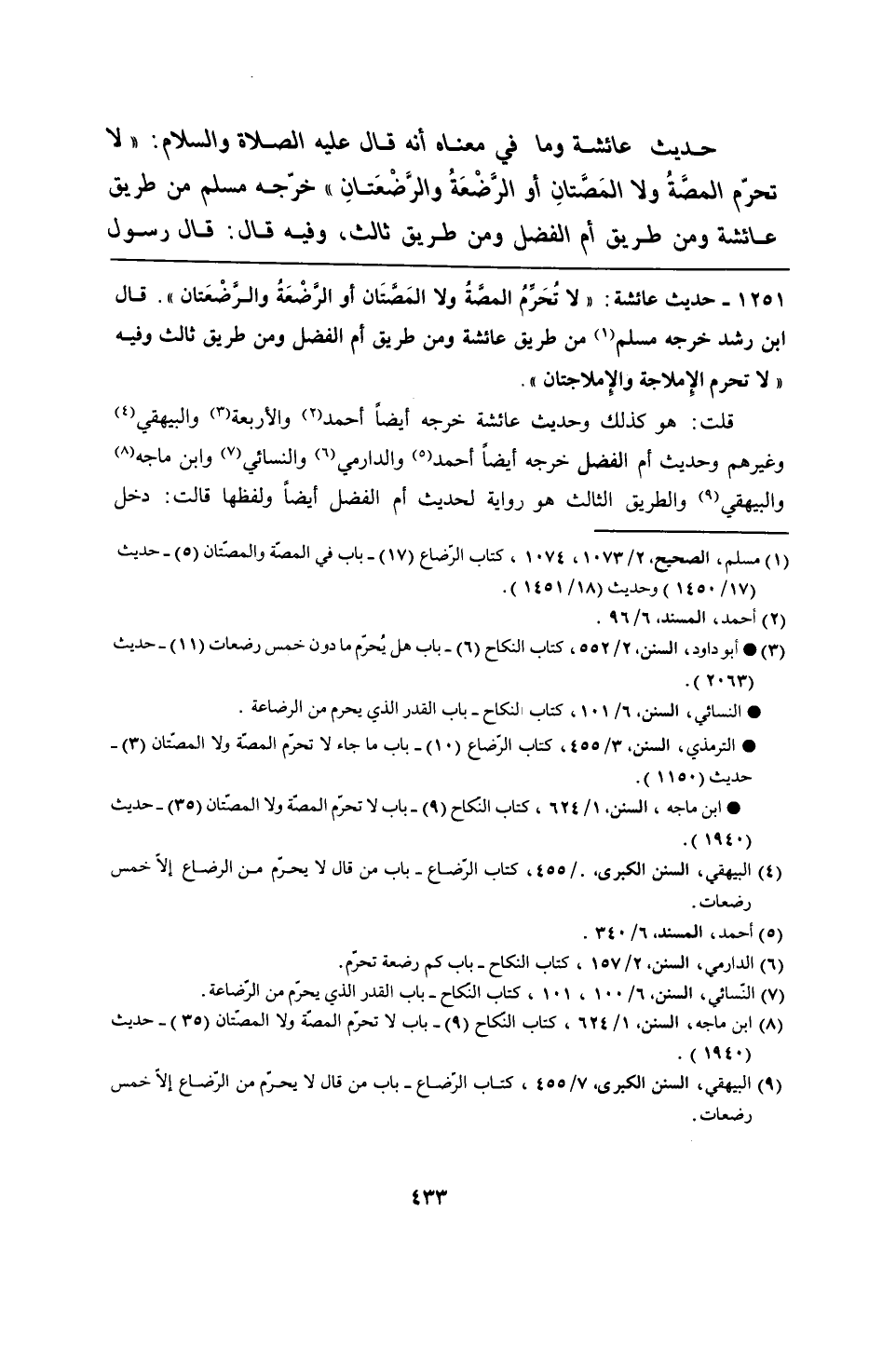 1251 - حديث عائشة: "لا تُحَرِّمُ المصَّةُ ولا المَصَّتَان أو الرَّضْعَةُ والرَّضْعَتان". قال ابن رشد خرجه مسلم من طريق عائشة ومن طريق أم الفضل ومن طريق ثالث وفيه "لا تحرم الإِملاجة والإِملاجتان".