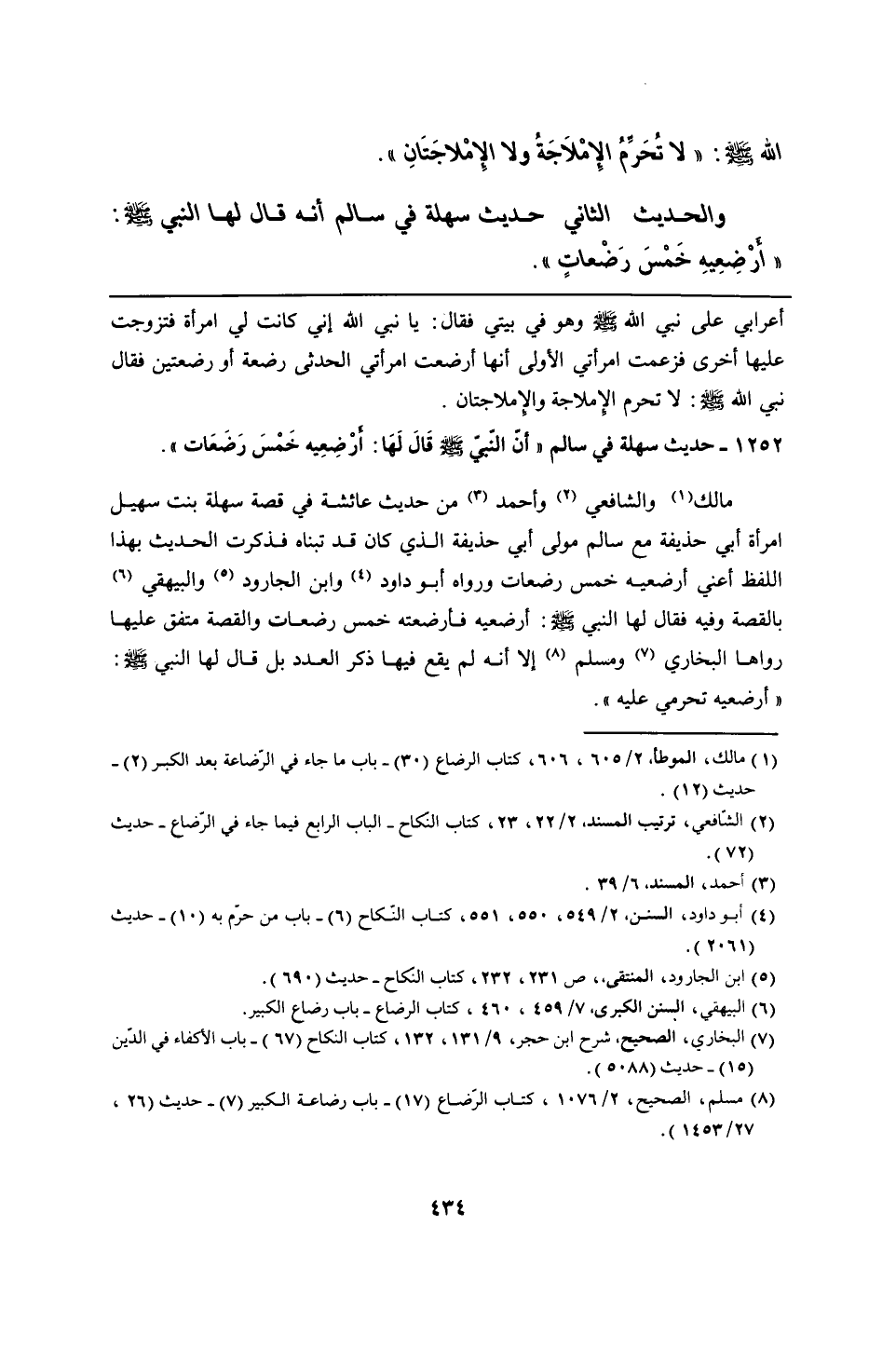 1252 - حديث سهلة في سالم "أنّ النّبي - صلى الله عليه وسلم - قَالَ لَهَا: أرْضِعِيه خَمْسَ رَضَعَات".