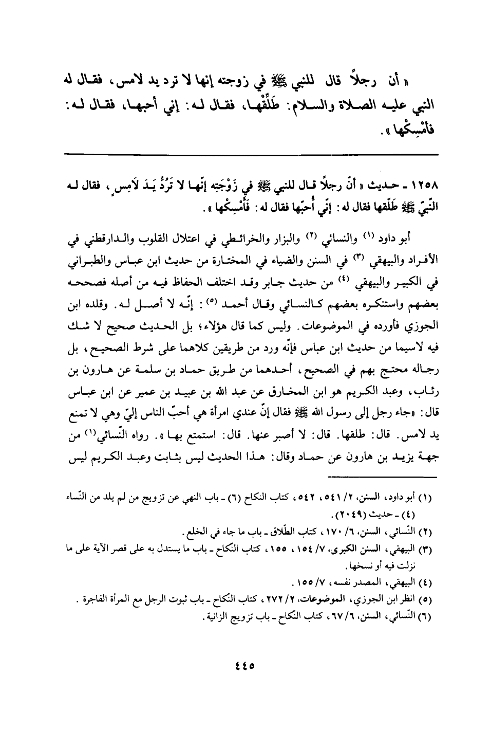 أبو داود والنسائي والبزار والخرائطي في اعتلال القلوب والدارقطني في الأفراد والبيهقي في السنن والضياء في المختارة من حديث ابن عباس والطبراني في الكبير والبيهقي من حديث جابر وقد اختلف الحفاظ فيه من أصله فصححه بعضهم واستنكره بعضهم كالنسائي وقال أحمد: إنّه لا أصل له. وقلده ابن الجوزي فأورده في الموضوعات، وليس كما قال هؤلاء؛ بل الحديث صحيح لا شك فيه لاسيما من حديث ابن عباس فإنّه ورد من طريقين كلاهما على شرط الصحيح، بل رجاله محتج بهم في الصحيح، أحدهما من طريق حماد بن سلمة عن هارون بن رئاب، وعبد الكريم هو ابن المخارق عن عبد الله بن عبيد بن عمير عن ابن عباس قال: "جاء رجل إلى رسول الله - صلى الله عليه وسلم - فقال إنّ عندي امرأة هي أحبّ الناس إليّ وهي لا تمنع يد لامس. قال: طلقها. قال: لا أصبر عنها. قال: استمتع بها". رواه النّسائي من جهة يزيد بن هارون عن حماد وقال: هذا الحديث ليس بثابت وعبد الكريم ليس