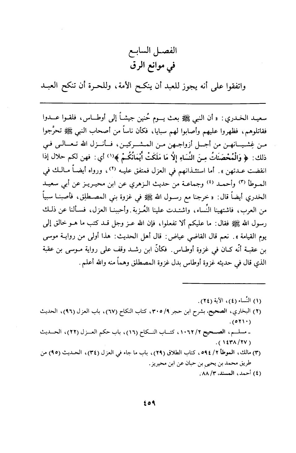 سعيد الخدري: "أن النبي - صلى الله عليه وسلم - بعث يوم حُنين جيشًا إلى أوطاس، فلقوا عدوا فقاتلوهم، فظهروا عليهم وأصابوا لهم سبايا، فكأن ناسًا من أصحاب النبي - صلى الله عليه وسلم - تحرَّجوا من غِشيانهن من أجل أزواجهن من المشركين، فأنزل الله تعالى في ذلك: {وَالْمُحْصَنَاتُ مِنَ النِّسَاءِ إِلَّا مَا مَلَكَتْ أَيْمَانُكُمْ} أي: فهن لكم حلال إذا انقضت عدتهن". أما استئذانهم في العزل فمتفق عليه، ورواه أيضًا مالك في الموطأ وأحمد وجماعة من حديث الزهري عن ابن محيريز عن أبي سعيد الخدري أيضًا قال: "خرجنا مع رسول الله - صلى الله عليه وسلم - في غزوة بني المصطلِق، فأصبنا سبيًا من العرب، فاشتهينا النِّساء، واشتدت علينا العُزبة. وأحببنا العزل، فسألنا عن ذلك رسول الله - صلى الله عليه وسلم - فقال: ما عليكم ألا تفعلوا، فإن الله -عز وجل- قد كتب ما هو خالق إلى يوم القيامة". نعم قال القاضي عياض: قال أهل الحديث: هذا أولى من رواية موسى بن عقبة أنّه كان في غزوة أوطاس. فكأنّ ابن رشد وقف على رواية موسى بن عقبة الذي قال في حديثه غزوة أوطاس بدل غزوة المصطلق وهمًا منه والله أعلم.