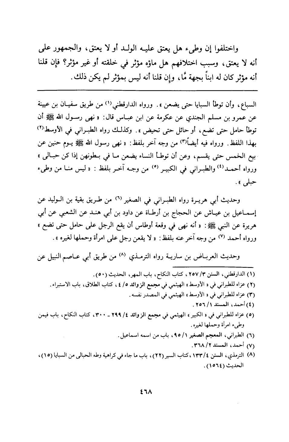 وحديث أبي هريرة رواه الطبراني في الصغير من طريق بقية بن الوليد عن إسماعيل بن عياش عن الحجاج بن أرطاة عن داود بن أبي هند عن الشعبي عن أبي هريرة عن النبي - صلى الله عليه وسلم -: "أنه نهى في وقعة أوطاس أن يقع الرجل على حامل حتى تضع" ورواه أحمد من وجه آخر عنه بلفظ: "لا يقعن رجل على امرأة وحملها لغيره".