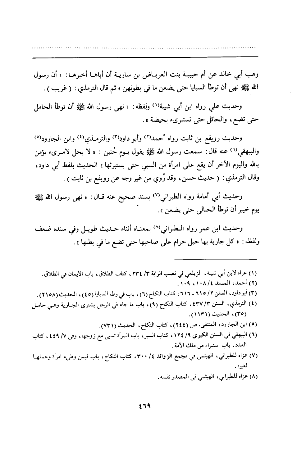 وحديث رويفع بن ثابت رواه أحمد وأبو داود والترمذي وابن الجارود والبيهقي عنه قال: سمعت رسول الله - صلى الله عليه وسلم - يقول يوم حُنين: "لا يحل لامرئ يؤمن بالله واليوم الآخر أن يقع على امرأة من السبي حتى يستبرئها" الحديث بلفظ أبي داود، وقال الترمذي: (حديث حسن، وقد رُوي من غير وجه عن رويفع بن ثابت).