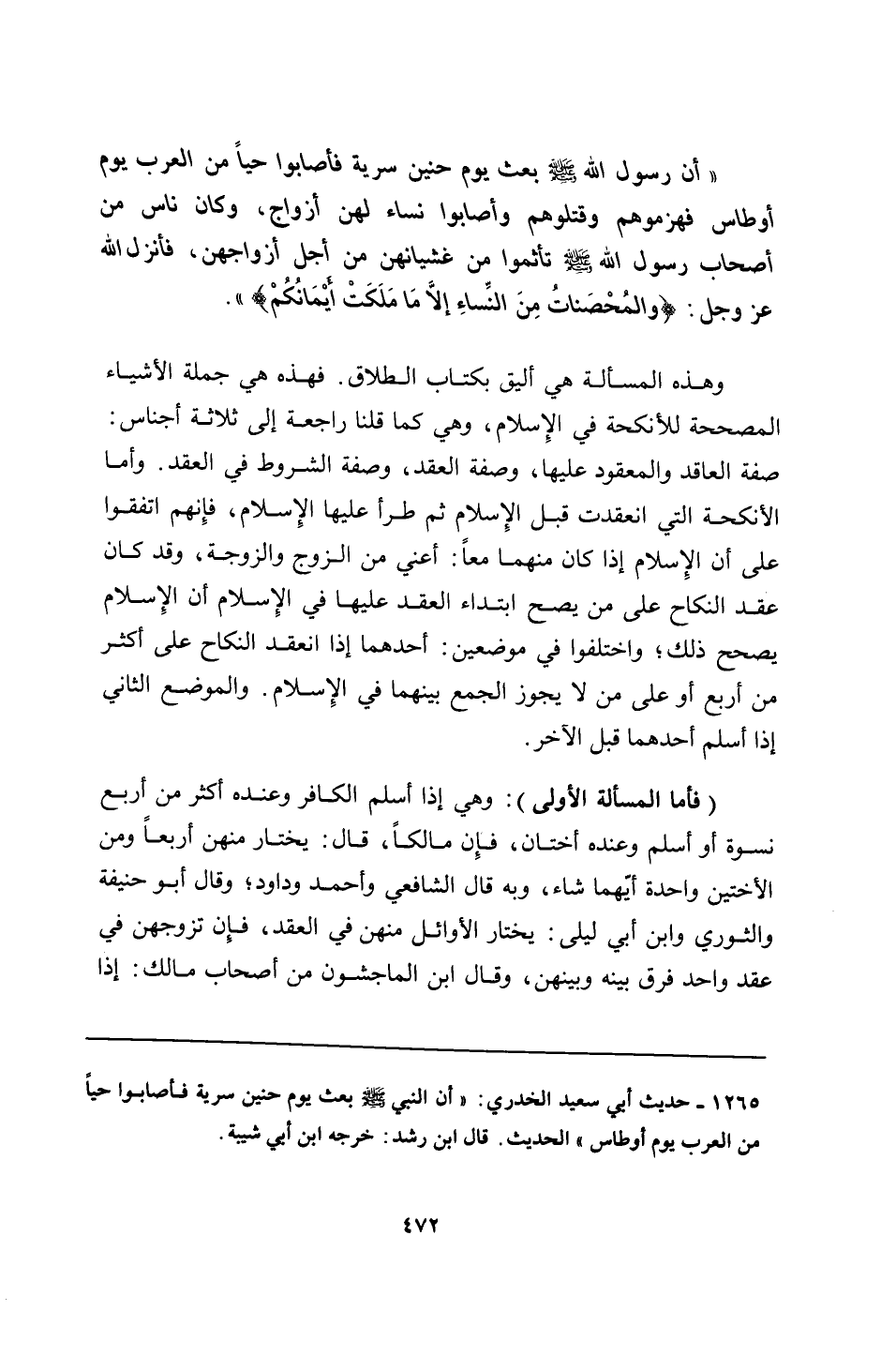 1265 - حديث أبي سعيد الخدري: "أن النبي - صلى الله عليه وسلم - بعث يوم حنين سرية فأصابوا حيًا من العرب يوم أوطاس" الحديث. قال ابن رشد: خرجه ابن أبي شيبة.