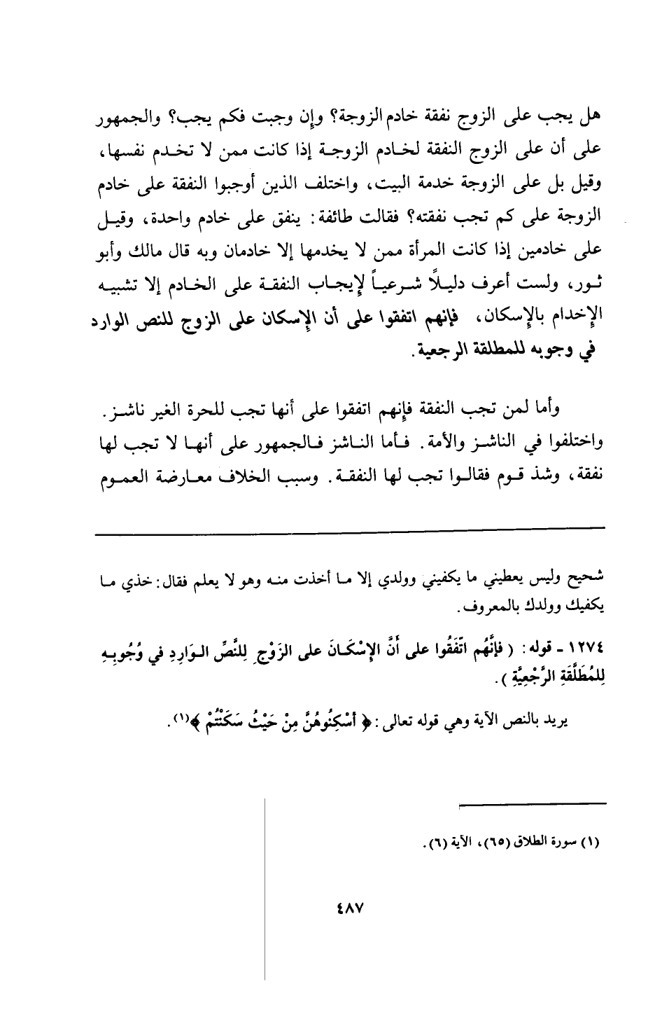 1274 - قوله: (فإنَّهُم اتفَقُوا على أنَّ الإسْكَانَ على الزَوْجِ لِلنَّصِّ الوَارِدِ في وُجُوبِهِ لِلمُطَلَّقَةِ الرَّجْعيَّةِ).