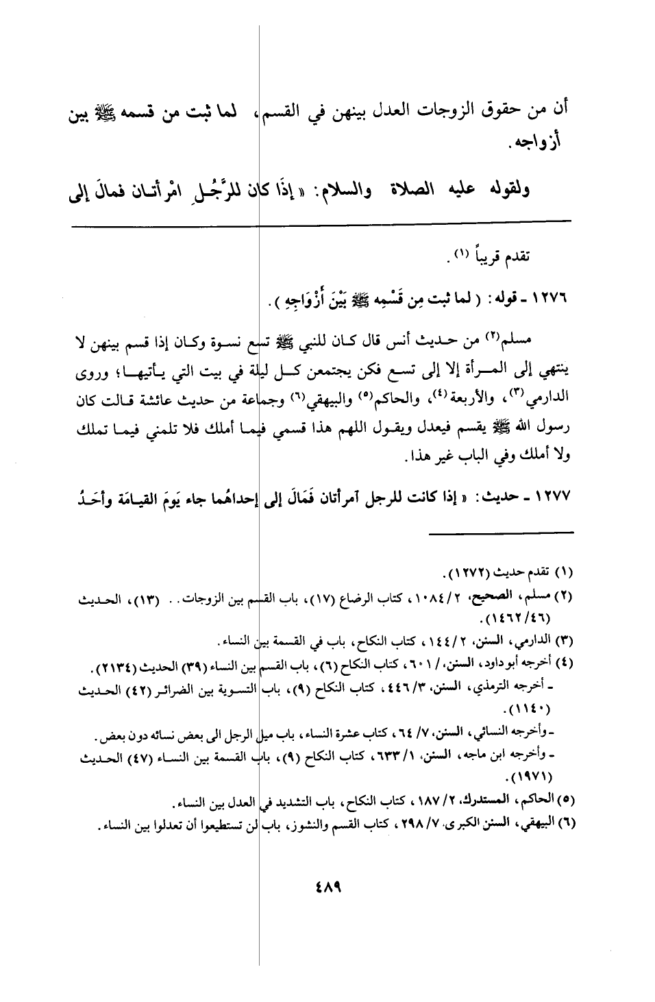 1277 - حديث: "إذا كانت للرجل امرأتان فَمَالَ إلى إحداهُما جاء يَومَ القيامَة وأحَدُ