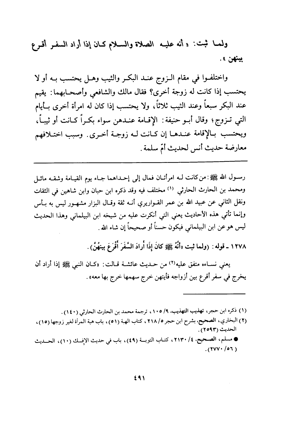1278 - قوله: (ولما ثبت "أنَّهُ - صلى الله عليه وسلم - كانَ إِذَا أرادَ السَّفَرَ أقْرَعَ بينهُنَّ).