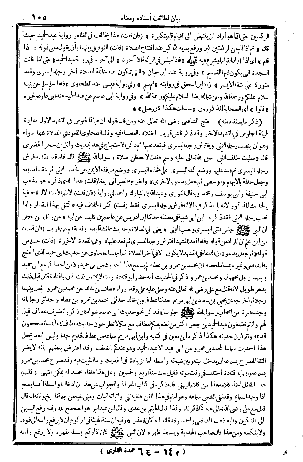 الرَّكْعَتَيْنِ حَتَّى إِذا هُوَ أَرَادَ أَن ينتهض إِلَى الْقيام قَامَ بتكبيرة) . قلت: هَذَا يُخَالف فِي الظَّاهِر رِوَايَة عبد الحميد حَيْثُ قَالَ: (ثمَّ إِذا قَامَ من الرَّكْعَتَيْنِ كبر وَرفع يَدَيْهِ كَمَا كبر عِنْد افْتِتَاح الصَّلَاة) . قلت: التَّوْفِيق بَينهمَا بِأَن يَقُول معنى قَوْله: (إِذا قَامَ أَي: إِذا أَرَادَ الْقيام أَو شرع فِيهِ. قَوْله: (فَإِذا جلس فِي الرَّكْعَة الْآخِرَة. .) إِلَى آخِره، فِي رِوَايَة عبد الحميد: (حَتَّى إِذا كَانَت السَّجْدَة الَّتِي يكون فِيهَا التَّسْلِيم) ، وَفِي رِوَايَة عِنْد ابْن حبَان: (الَّتِي تكون عِنْد خَاتِمَة الصَّلَاة، أخر رجله الْيُسْرَى وَقعد متوركا على شقَّه الْأَيْسَر) . زَاد ابْن إِسْحَاق فِي رِوَايَته: (ثمَّ سلم) . وَفِي رِوَايَة عِيسَى عِنْد الطَّحَاوِيّ: (فَلَمَّا سلم سلم عَن يَمِينه: السَّلَام عَلَيْكُم وَرَحْمَة الله، وَعَن شِمَاله أَيْضا: السَّلَام عَلَيْكُم وَرَحْمَة الله) وَفِي رِوَايَة أبي عَاصِم عَن عبد الحميد عِنْد أبي دَاوُد وَغَيره (قَالُوا) أَي: الصَّحَابَة المذكورون: (صدقت، هَكَذَا كَانَ يُصَلِّي) . ذكر مَا يُسْتَفَاد مِنْهُ: احْتج الشَّافِعِي، رَضِي الله تَعَالَى عَنهُ، وَمن قَالَ بقوله أَن هَيْئَة الْجُلُوس فِي التَّشَهُّد الأول مُغَايرَة لهيئة الْجُلُوس فِي التَّشَهُّد الْأَخير، وَقد ذكرنَا عَن قريب اخْتِلَاف الْعلمَاء فِيهِ. وَقَالَ الطَّحَاوِيّ: الْقعُود فِي الصَّلَاة كلهَا سَوَاء، وَهُوَ أَن ينصب رجله الْيُمْنَى ويفترش رجله الْيُسْرَى فيقعد عَلَيْهَا، ثمَّ ذكر الِاحْتِجَاج فِي هَذَا بِحَدِيث وَائِل بن حجر الْحَضْرَمِيّ، قَالَ: (صليت خلف النَّبِي، صلى الله عَلَيْهِ وَسلم، فَقلت: لأحفظن صَلَاة رَسُول الله صلى الله عَلَيْهِ وَسلم، قَالَ: فَلَمَّا قعد للتَّشَهُّد فرش رجله الْيُسْرَى ثمَّ قعد عَلَيْهَا وَوضع كَفه الْيُسْرَى على فَخذه الْيُسْرَى وَوضع مرفقه الْأَيْمن على فَخذه الْيُمْنَى، ثمَّ عقد أَصَابِعه وَجعل حَلقَة بالإبهام وَالْوُسْطَى، ثمَّ جعل يَدْعُو بِالْأُخْرَى) . وَأخرجه الطَّبَرَانِيّ أَيْضا. قلت: هَذَا الَّذِي ذكره هُوَ مَذْهَب أبي حنيفَة وَأبي يُوسُف وَمُحَمّد، وَبِه قَالَ الثَّوْريّ وَعبد الله بن الْمُبَارك وَأحمد فِي رِوَايَة. فَإِن قلت: لَا يتم الِاسْتِدْلَال للحنفية بِالْحَدِيثِ الْمَذْكُور، لِأَنَّهُ لم يذكر فِيهِ إلاّ أَنه فرش رجله الْيُسْرَى فَقَط. قلت: كثر الْخلاف فِيهِ فَاكْتفى بِهَذَا الْمِقْدَار، وَأما نصب رجله الْيُمْنَى فقد ذكرهه ابْن أبي شيبَة فِي (مُصَنفه) : حَدثنَا ابْن إِدْرِيس عَن عَاصِم بن كُلَيْب عَن أَبِيه (عَن وَائِل بن حجر أَن النَّبِي صلى الله عَلَيْهِ وَسلم جلس فَثنى الْيُسْرَى وَنصب الْيُمْنَى) ، يَعْنِي فِي الصَّلَاة. وَحَدِيث عَائِشَة أَيْضا، وَقد تقدم عَن قريب. فَإِن قلت: من أَيْن علم أَن المُرَاد من قَوْله: (فَلَمَّا قعد للتَّشَهُّد أفترش رجله الْيُسْرَى ثمَّ قعد عَلَيْهَا) وَهِي الْقعدَة الْأَخِيرَة؟ قلت: علم من قَوْله: (ثمَّ جعل يَدْعُو) ، أَن الدُّعَاء فِي التَّشَهُّد لَا يكون إلاّ فِي آخر الصَّلَاة، ثمَّ أجَاب الطَّحَاوِيّ عَن حَدِيث أبي حميد الَّذِي احْتج بِهِ الشَّافِعِي وَغَيره بِمَا ملخصه: أَن مُحَمَّد بن عَمْرو بن عَطاء لم يسمع هَذَا الحَدِيث من أبي حميد، وَلَا من أحد ذكر مَعَ أبي حميد، وَبَينهمَا رجل مَجْهُول، وَمُحَمّد بن عَمْرو ذكر فِي الحَدِيث أَنه حضر أَبُو قَتَادَة وسنه لَا يحْتَمل ذَلِك، فَإِن أَبَا قَتَادَة قتل قبل ذَلِك بدهر طَوِيل، لِأَنَّهُ قتل مَعَ عَليّ، رَضِي الله تَعَالَى عَنهُ، وَصلى عَلَيْهِ عَليّ، وَقد رَوَاهُ عطاف بن خَالِد عَن مُحَمَّد بن عَمْرو، فَجعل بَينهمَا رجلا. ثمَّ أخرجه عَن يحيى بن سعيد بن أبي مَرْيَم: حَدثنَا عطاف بن خَالِد حَدثنِي مُحَمَّد بن عَمْرو بن عَطاء (حَدثنِي رجل أ