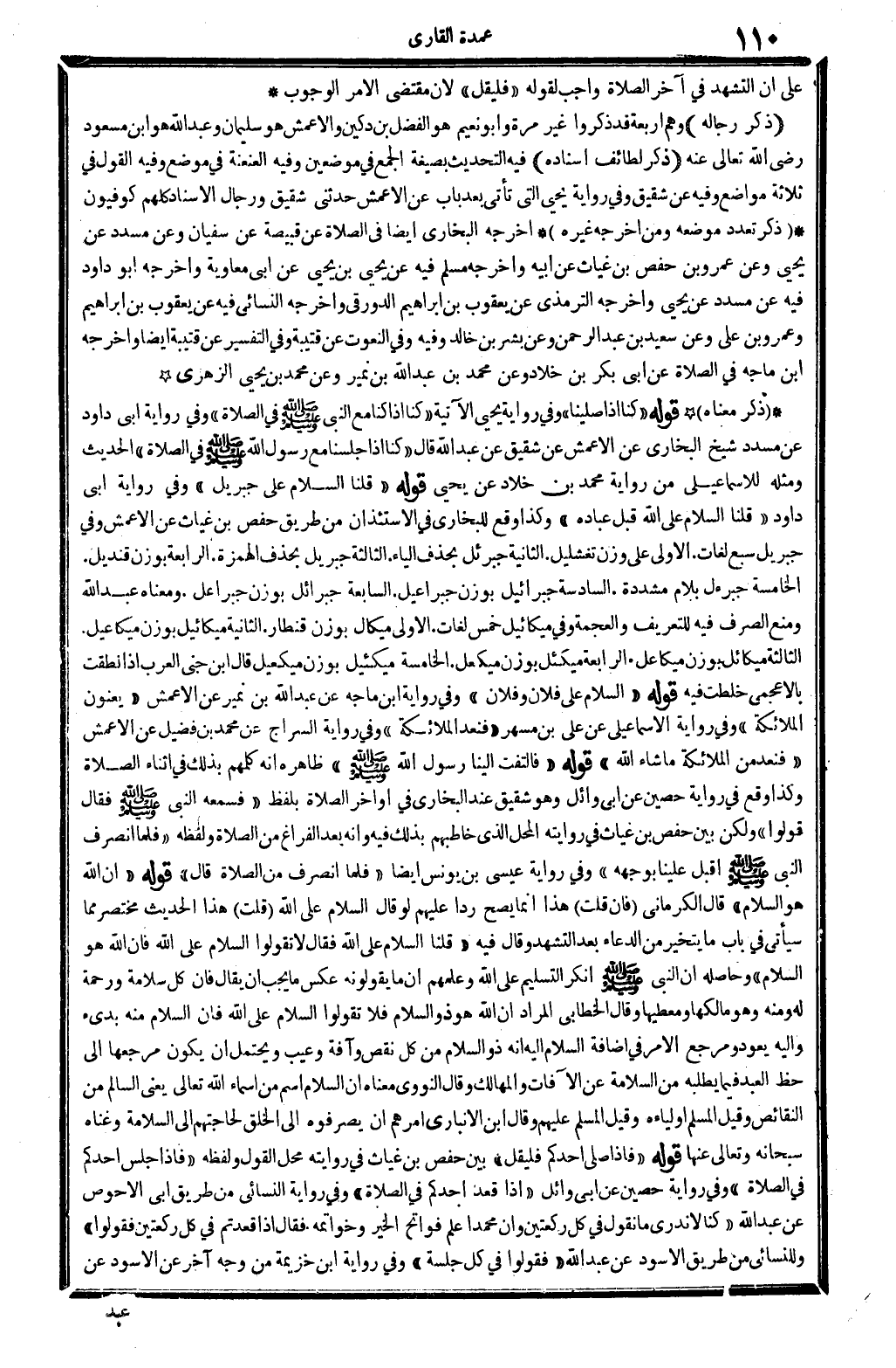 على أَن التَّشَهُّد فِي آخر الصَّلَاة وَاجِب لقَوْله " فَلْيقل " لِأَن مُقْتَضى الْأَمر الْوُجُوب (ذكر رِجَاله) وهم أَرْبَعَة قد ذكرُوا غير مرّة وَأَبُو نعيم هُوَ الْفضل بن دُكَيْن وَالْأَعْمَش هُوَ سُلَيْمَان وَعبد الله هُوَ ابْن مَسْعُود رَضِي الله تَعَالَى عَنهُ (ذكر لطائف إِسْنَاده) فِيهِ التحديث بِصِيغَة الْجمع فِي موضِعين وَفِيه العنعنة فِي مَوضِع وَفِيه القَوْل فِي ثَلَاثَة مَوَاضِع وَفِيه عَن شَقِيق وَفِي رِوَايَة يحيى الَّتِي تَأتي بعد بَاب عَن الْأَعْمَش حَدثنِي شَقِيق وَرِجَال الْإِسْنَاد كلهم كوفيون. (ذكر تعدد مَوْضِعه وَمن أخرجه غَيره) أخرجه البُخَارِيّ أَيْضا فِي الصَّلَاة عَن قبيصَة عَن سُفْيَان وَعَن مُسَدّد عَن يحيى وَعَن عَمْرو بن حَفْص بن غياث عَن أَبِيه وَأخرجه مُسلم فِيهِ عَن يحيى بن يحيى عَن أبي مُعَاوِيَة وَأخرجه أَبُو دَاوُد فِيهِ عَن مُسَدّد عَن يحيى وَأخرجه التِّرْمِذِيّ عَن يَعْقُوب بن إِبْرَاهِيم الدَّوْرَقِي وَأخرجه النَّسَائِيّ فِيهِ عَن يَعْقُوب بن إِبْرَاهِيم وَعَمْرو بن عَليّ وَعَن سعيد بن عبد الرَّحْمَن وَعَن بشر بن خَالِد وَفِيه وَفِي النعوت عَن قُتَيْبَة وَفِي التَّفْسِير عَن قُتَيْبَة أَيْضا وَأخرجه ابْن ماجة فِي الصَّلَاة عَن أبي بكر بن خَلاد وَعَن مُحَمَّد بن عبد الله بن نمير وَعَن مُحَمَّد بن يحيى الزُّهْرِيّ (ذكر مَعْنَاهُ) قَوْله " كُنَّا إِذا صلينَا " وَفِي رِوَايَة يحيى الْآتِيَة " كُنَّا إِذا كُنَّا مَعَ النَّبِي - صَلَّى اللَّهُ عَلَيْهِ وَسَلَّم َ - فِي الصَّلَاة " وَفِي رِوَايَة أبي دَاوُد عَن مُسَدّد شيخ البُخَارِيّ عَن الْأَعْمَش عَن شَقِيق عَن عبد الله قَالَ " كُنَّا إِذا جلسنا مَعَ رَسُول الله - صَلَّى اللَّهُ عَلَيْهِ وَسَلَّم َ - فِي الصَّلَاة " الحَدِيث وَمثله للإسماعيلي من رِوَايَة مُحَمَّد بن خَلاد عَن يحيى قَوْله " قُلْنَا السَّلَام على جِبْرِيل " وَفِي رِوَايَة أبي دَاوُد " قُلْنَا السَّلَام على الله قبل عباده " وَكَذَا وَقع للْبُخَارِيّ فِي الاسْتِئْذَان من طَرِيق حَفْص بن غياث عَن الْأَعْمَش وَفِي جِبْرِيل سبع لُغَات. الأولى على وزن تغشليل. الثَّانِيَة جبرئل بِحَذْف الْيَاء. الثَّالِثَة جِبْرِيل بِحَذْف الْهمزَة. الرَّابِعَة بِوَزْن قنديل. الْخَامِسَة جبرءل بلام مُشَدّدَة. السَّادِسَة جِبْرَائِيل بِوَزْن جبراعيل. السَّابِعَة جبرائل بِوَزْن جبراعل. وَمَعْنَاهُ عبد الله وَمنع الصّرْف فِيهِ للتعريف والعجمة فِي مِيكَائِيل خمس لُغَات. الأولى ميكال بِوَزْن قِنْطَار. الثَّانِيَة مِيكَائِيل بِوَزْن ميكاعيل. الثَّالِثَة ميكائل بِوَزْن ميكاعل. الرَّابِعَة ميكئل بِوَزْن ميكعل. الْخَامِسَة ميكئيل بِوَزْن ميكعيل. قَالَ ابْن جني الْعَرَب إِذا نطقت بالأعجمي خلطت فِيهِ قَوْله " السَّلَام على فلَان وَفُلَان " وَفِي رِوَايَة ابْن ماجة عَن عبد الله بن نمير عَن الْأَعْمَش " يعنون الْمَلَائِكَة " وَفِي رِوَايَة الْإِسْمَاعِيلِيّ عَن عَليّ بن مسْهر " فنعد الْمَلَائِكَة " وَفِي رِوَايَة السراج عَن مُحَمَّد بن فُضَيْل عَن الْأَعْمَش " فنعد من الْمَلَائِكَة مَا شَاءَ الله " قَوْله " فَالْتَفت إِلَيْنَا رَسُول الله - صَلَّى اللَّهُ عَلَيْهِ وَسَلَّم َ - " ظَاهره أَنه كَلمهمْ بذلك فِي أثْنَاء الصَّلَاة وَكَذَا وَقع فِي رِوَايَة حُصَيْن عَن أبي وَائِل وَهُوَ شَقِيق عِنْد البُخَارِيّ فِي أَوَاخِر الصَّلَاة بِلَفْظ " فَسَمعهُ النَّبِي - صَلَّى اللَّهُ عَلَيْهِ وَسَلَّم َ - فَقَالَ قُولُوا " وَلَكِن بَين حَفْص بن غياث فِي رِوَايَته الْمحل الَّذِي خاطبهم بذلك فِيهِ وَأَنه بعد الْفَرَاغ من الصَّلَاة وَلَفظه " فَلَمَّا انْصَرف النَّبِي - صَلَّى اللَّهُ عَلَيْهِ وَسَلَّم َ - أقبل علينا بِوَجْهِهِ " وَفِي رِوَايَة عِيسَى بن يُونُس أَيْضا " فَلَمَّا انْصَرف من الصَّلَاة قَالَ " قَوْله " إِن الله هُوَ