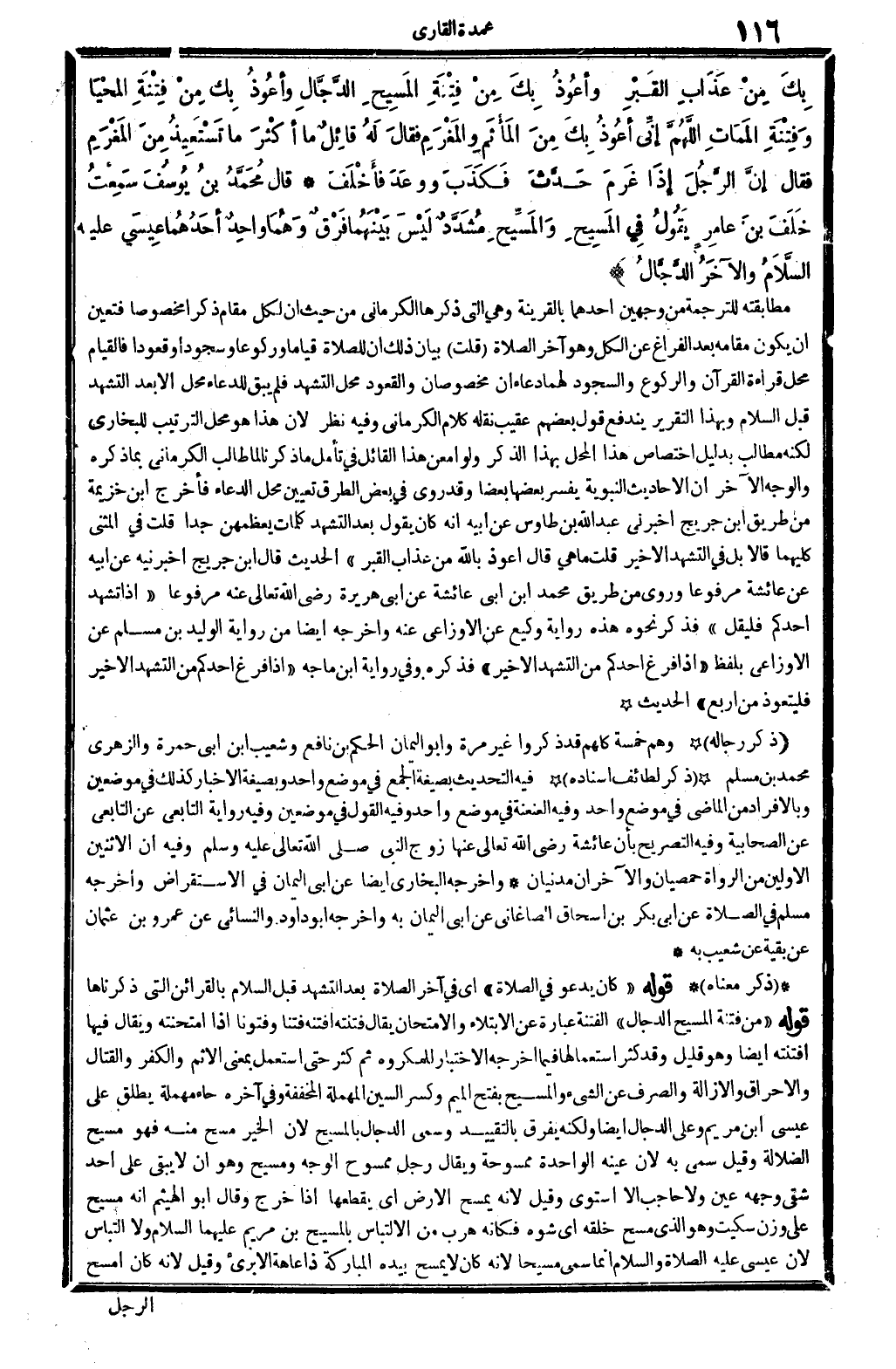 بِكَ مِنْ عَذَابِ القَبْرِ وأعُوذُ بِكَ مِنْ فِتْنَةِ المَسِيحِ الدَّجَّالِ وأعُوذُ بِكَ مِن فِتْنَةِ المَحْيَا وَفِتْنَةِ المَمَاتِ اللَّهُمَّ إنِّي أعُوذُ بِكَ مِنَ المَأْثَمِ والمَغْرَمِ فقالَ لَهُ قائِلٌ مَا أكْثَرَ مَا تَسْتَعِيذُ مِنَ المَغْرَمِ فَقَالَ إنَّ الرَّجُلَ إذَا غَرَمَ حَدَّثَ فَكَذَبَ ووعَدَ فأخْلَفَ. قَالَ مُحَمَّدُ بنُ يُوسُف سَمِعْتُ خَلَفَ بنَ عَامِرٍ يَقُولُ فِي المَسِيحِ وَالمَسِيحِ مُشَدَّدٌ لَيْسَ بَيْنَهُمَا فَرْقٌ وَهُمَا واحِدٌ أحَدُهُمَا عِيسَى عَلَيْهِ السَّلاَمُ والآخَرُ الدَّجَّالُ. .