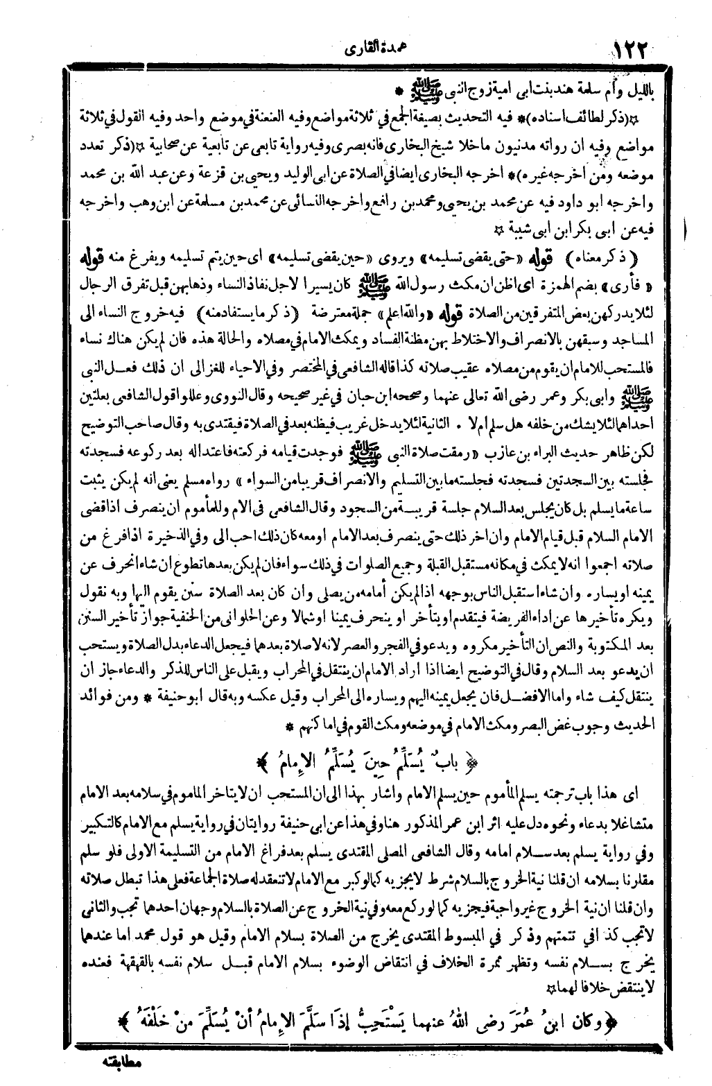 أَي: هَذَا بَاب تَرْجَمته: يسلم الْمَأْمُوم حِين يسلم الإِمَام، وَأَشَارَ بِهَذَا إِلَى أَن لَا يتَأَخَّر الْمَأْمُوم فِي سَلَامه بعد الإِمَام متشاغلاً بِدُعَاء وَنَحْوه، دلّ عَلَيْهِ أثر ابْن عمر الْمَذْكُور هُنَا، وَفِي هَذَا عَن أبي حنيفَة رِوَايَتَانِ، فِي رِوَايَة: يسلم مَعَ الإِمَام كالتكبير، وَفِي رِوَايَة: يسلم بعد سَلام إِمَامه. وَقَالَ الشَّافِعِي: الْمُصَلِّي الْمُقْتَدِي يسلم بعد فرَاغ الإِمَام من التسليمة الأولى، فَلَو سلم مُقَارنًا بسلامه إِن قُلْنَا: نِيَّة الْخُرُوج بِالسَّلَامِ شَرط، لَا يجْزِيه، كَمَا لَو كبر مَعَ الإِمَام لَا تَنْعَقِد لَهُ صَلَاة الْجَمَاعَة، فعلى هَذَا تبطل صلَاته. وَإِن قُلْنَا: إِن نِيَّة الْخُرُوج غير وَاجِبَة، فيجزيه كَمَا لَو ركع مَعَه، وَفِي نِيَّة الْخُرُوج عَن الصَّلَاة بِالسَّلَامِ وَجْهَان: أَحدهمَا: تجب، وَالثَّانِي لَا تجب، كَذَا فِي تتمتهم. وَذكر فِي (الْمَبْسُوط) : الْمُقْتَدِي يخرج من الصَّلَاة بِسَلام الإِمَام. وَقيل: هُوَ قَول مُحَمَّد. أما عِنْدهمَا يخرج بِسَلام نَفسه، وَتظهر ثَمَرَة الْخلاف فِي انْتِقَاض الْوضُوء بِسَلام الإِمَام قبل سَلام نَفسه بالقهقهة، فَعنده لَا ينْتَقض خلافًا لَهما.