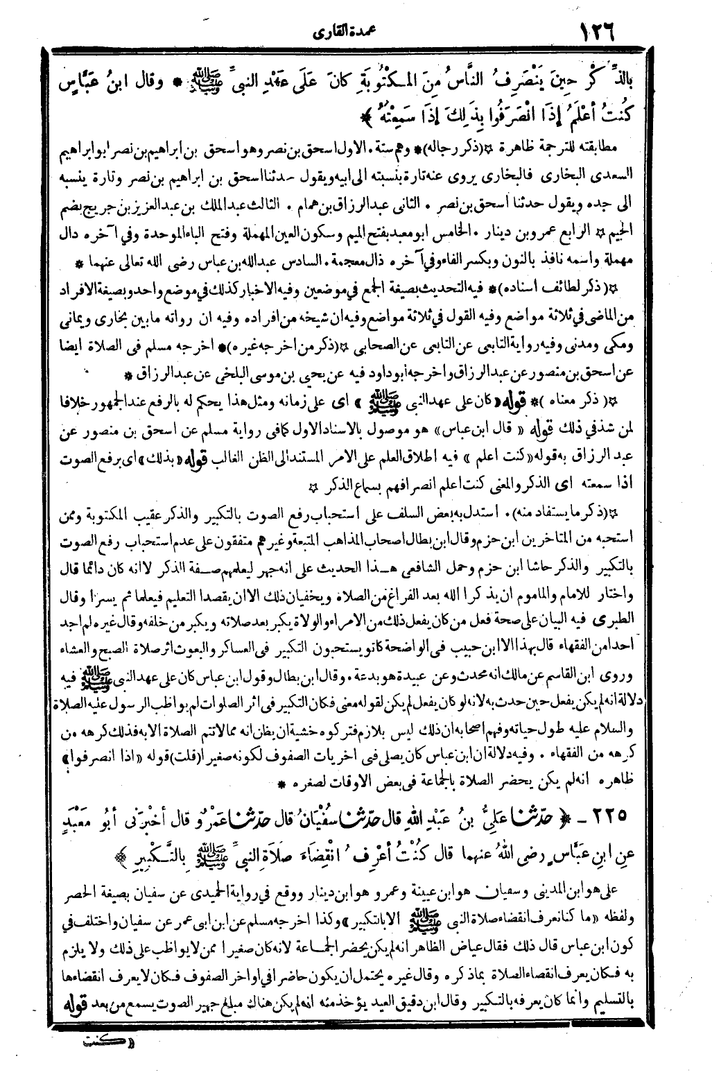 عَليّ هُوَ ابْن الْمَدِينِيّ، وسُفْيَان هُوَ ابْن عُيَيْنَة، وَعَمْرو هُوَ ابْن دِينَار، وَوَقع فِي رِوَايَة الْحميدِي عَن سُفْيَان بِصِيغَة الْحصْر وَلَفظه: (مَا كُنَّا نَعْرِف انْقِضَاء صَلَاة النَّبِي صلى الله عَلَيْهِ وَسلم، إلاّ بِالتَّكْبِيرِ) ، وَكَذَا أخرجه مُسلم عَن ابْن أبي عمر عَن سُفْيَان. وَاخْتلف فِي كَون ابْن عَبَّاس قَالَ ذَلِك، فَقَالَ عِيَاض: الظَّاهِر أَنه لم يكن يحضر الْجَمَاعَة، لِأَنَّهُ كَانَ صَغِيرا مِمَّن لَا يواظب على ذَلِك، وَلَا يلْزم بِهِ، فَكَانَ يعرف انْقِضَاء الصَّلَاة بِمَا ذكره. وَقَالَ غَيره: يحْتَمل أَن يكون حَاضرا فِي أَوَاخِر الصُّفُوف، فَكَانَ لَا يعرف انقضاءها بِالتَّسْلِيمِ، وَإِنَّمَا كَانَ يعرفهُ بِالتَّكْبِيرِ. وَقَالَ ابْن دَقِيق الْعِيد: يُؤْخَذ مِنْهُ أَنه لم يكن هُنَاكَ مبلغ جهير الصَّوْت يسمع من بعد. قَوْله: