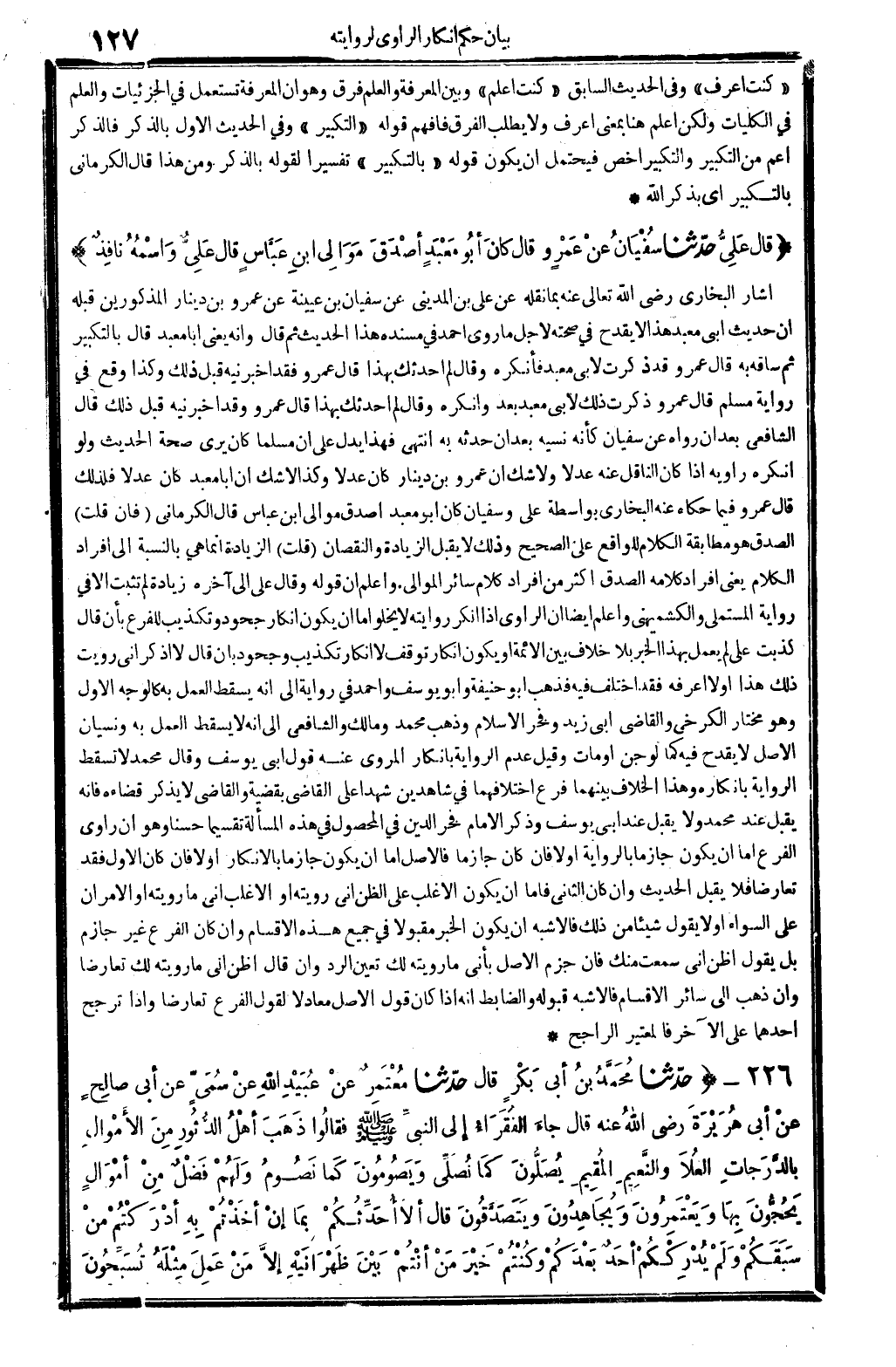 أَشَارَ البُخَارِيّ، رَضِي الله تَعَالَى عَنهُ، بِمَا نَقله عَن عَليّ بن الْمَدِينِيّ عَن سُفْيَان بن عُيَيْنَة عَن عَمْرو بن دِينَار الْمَذْكُورين قبله أَن حَدِيث أبي معبد هَذَا لَا يقْدَح فِي صِحَّته لأجل مَا روى أَحْمد فِي (مُسْنده) هَذَا الحَدِيث. ثمَّ قَالَ: وَإنَّهُ يَعْنِي: أَبَا معبد قَالَ بِالتَّكْبِيرِ، ثمَّ سَاقه بِهِ. قَالَ عَمْرو: قد ذكرت لأبي معبد فَأنكرهُ، وَقَالَ: لم أحَدثك بِهَذَا. قَالَ عَمْرو: فقد أخبرنيه قبل ذَلِك، وَكَذَا وَقع فِي رِوَايَة مُسلم: قَالَ عَمْرو: ذكرت ذَلِك لأبي معبد بعد وَأنْكرهُ، وَقَالَ: لم أحَدثك بِهَذَا. قَالَ عَمْرو: وَقد أخبرنيه قبل ذَلِك، قَالَ الشَّافِعِي، بعد أَن رَوَاهُ عَن سُفْيَان: كَأَنَّهُ نَسيَه بعد أَن حَدثهُ بِهِ. انْتهى. فَهَذَا يدل على أَن مُسلما كَانَ يرى صِحَة الحَدِيث، وَلَو أنكرهُ رَاوِيه، إِذا كَانَ النَّاقِل عَنهُ عدلا، وَلَا شكّ أَن عَمْرو بن دِينَار كَانَ عدلا، وَكَذَا لَا شكّ أَن أَبَا معبد كَانَ عدلا، فَلذَلِك قَالَ عَمْرو، فِيمَا حَكَاهُ عَنهُ البُخَارِيّ بِوَاسِطَة عَليّ وسُفْيَان: كَانَ أَبُو معبد أصدق موَالِي ابْن عَبَّاس. قَالَ الْكرْمَانِي: فَإِن قلت: الصدْق هُوَ مُطَابقَة الْكَلَام للْوَاقِع على الصَّحِيح، وَذَلِكَ لَا يقبل الزِّيَادَة وَالنُّقْصَان؟ قلت: الزِّيَادَة إِنَّمَا هِيَ بِالنِّسْبَةِ إِلَى أَفْرَاد الْكَلَام، يَعْنِي إِفْرَاد كَلَامه الصدْق أَكثر من إِفْرَاد كَلَام سَائِر الموَالِي. وَاعْلَم أَن قَوْله: وَقَالَ عَليّ. . إِلَى آخِره، زِيَادَة لم تثبت إلاّ فِي رِوَايَة الْمُسْتَمْلِي والكشميهني، وَاعْلَم أَيْضا أَن الرَّاوِي إِذا أنكر رِوَايَته لَا يَخْلُو إِمَّا أَن يكون إِنْكَار جحود وَتَكْذيب للفرع بِأَن قَالَ: كذبت عَليّ، لم يعْمل بِهَذَا الْخَبَر بِلَا خلاف بَين الْأَئِمَّة، أَو يكون إِنْكَار توقف لَا إِنْكَار تَكْذِيب وجحود، بِأَن قَالَ: لَا أذكر أَنِّي رويت ذَلِك، هَذَا أَو لَا أعرفهُ، فقد اخْتلف فِيهِ، فَذهب أَبُو حنيفَة وَأَبُو يُوسُف وَأحمد فِي رِوَايَة إِلَى: أَنه يسْقط الْعَمَل بِهِ، كالوجه الأول، وَهُوَ مُخْتَار الْكَرْخِي وَالْقَاضِي أبي زيد وفخر الْإِسْلَام، وَذهب مُحَمَّد وَمَالك وَالشَّافِعِيّ إِلَى: أَنه لَا يسْقط الْعَمَل بِهِ، ونسيان الأَصْل لَا يقْدَح فِيهِ كَمَا لَو جن أَو مَاتَ. وَقيل: عدم الرِّوَايَة بإنكار الْمَرْوِيّ عَنهُ قَول أبي يُوسُف. وَقَالَ مُحَمَّد: لَا تسْقط الرِّوَايَة بإنكاره، وَهَذَا الْخلاف بَينهمَا فرغ اخْتِلَافهمَا فِي شَاهِدين شَهدا على القَاضِي بقضية، وَالْقَاضِي لَا يذكر قَضَاءَهُ، فَإِنَّهُ يقبل عِنْد مُحَمَّد، وَلَا يقبل عِنْد أبي يُوسُف. وَذكر الإِمَام فَخر الدّين فِي (الْمَحْصُول) فِي هَذِه الْمَسْأَلَة تقسيما حسنا، وَهُوَ أَن رواي الْفَرْع إِمَّا أَن يكون جَازِمًا بالرواية أَو لَا، فَإِن كَانَ جَازِمًا فَالْأَصْل إِمَّا أَن يكون جَازِمًا بالإنكار أَو لَا، فَإِن كَانَ الأول فقد تَعَارضا، فَلَا يقبل الحَدِيث، وَإِن كَانَ الثَّانِي فإمَّا أَن يكون الْأَغْلَب على الظَّن إِنِّي رويته، أَو الْأَغْلَب أَنِّي مَا رويته، أَو الْأَمْرَانِ على السوَاء، أَو لَا يَقُول شَيْئا من ذَلِك، فالأشبه أَن يكون الْخَبَر مَقْبُولًا فِي جَمِيع هَذِه الْأَقْسَام، وَإِن كَانَ الْفَرْع غير جازم بل يَقُول: أَظن أَنِّي سَمِعت مِنْك، فَإِن جزم الأَصْل: بِأَنِّي مَا رويته لَك، تعين الرَّد، وَإِن قَالَ: أَظن إِنِّي مَا رويته لَك تَعَارضا، وَإِن ذهب إِلَى سَائِر الْأَقْسَام، فالأشبه قبُوله، وَالضَّابِط أَنه إِذا كَانَ قَول الأَصْل معادلاً لقَوْل الْفَرْع تَعَارضا، وَإِذا ترجح أَحدهمَا على الآخر فالمعتير الرَّاجِح.