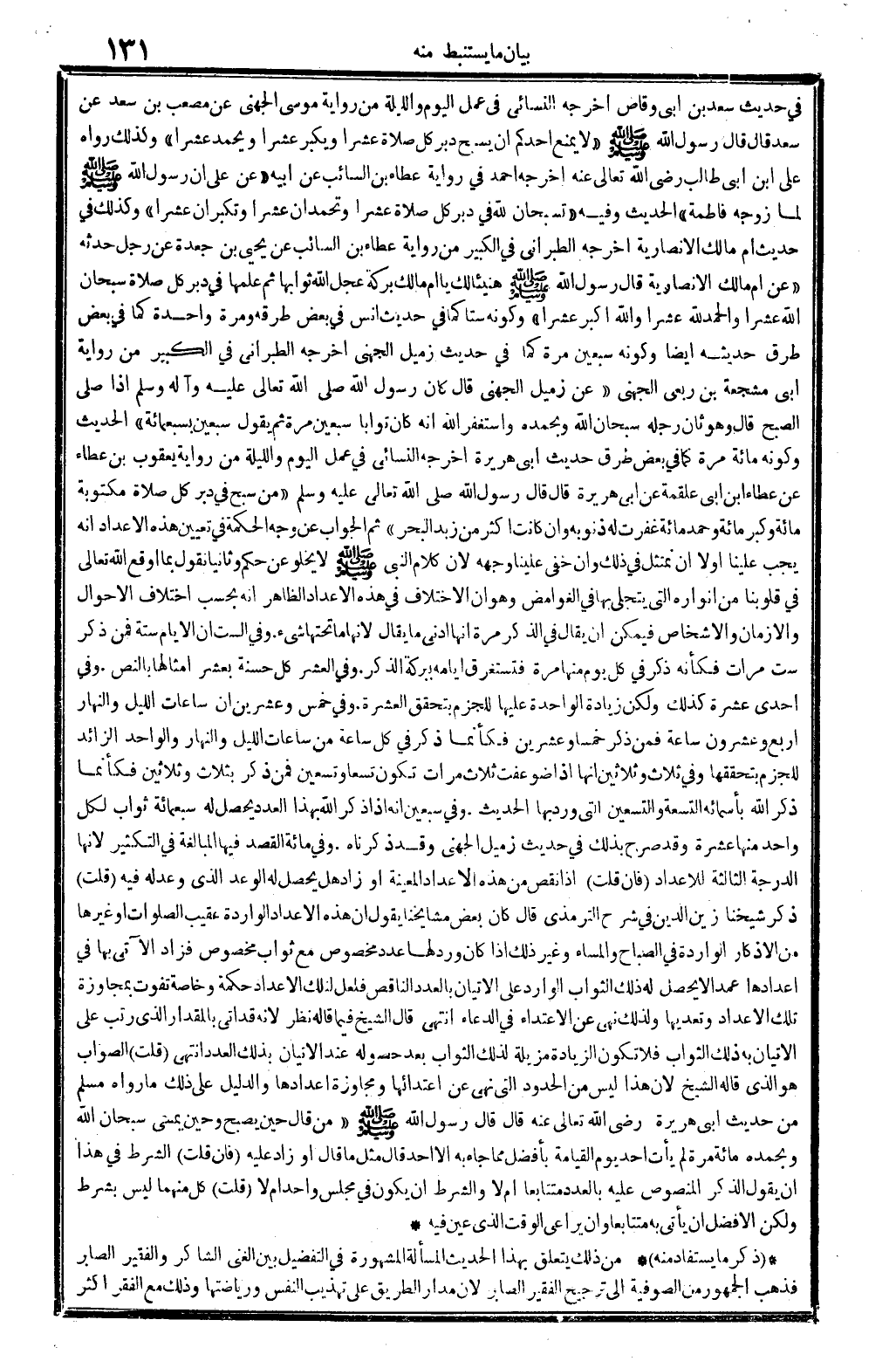 فِي حَدِيث عبد الله بن عمر، وَأخرجه التِّرْمِذِيّ وَالنَّسَائِيّ وَابْن مَاجَه من رِوَايَة عَطاء بن السَّائِب عَن أَبِيه عَن عبد الله بن عَمْرو، قَالَ: قَالَ رَسُول الله صلى الله عَلَيْهِ وَسلم: (خصلتان لَا يحصيهما رجل مُسلم إلاّ دخل الْجنَّة) الحَدِيث. وَفِيه: (يسبح الله أحدكُم فِي دبر كل صَلَاة عشرا، ويحمد عشرا، وَيكبر عشرا) . الحَدِيث فَهِيَ خَمْسُونَ وَمِائَة بِاللِّسَانِ، وَألف وَخَمْسمِائة فِي الْمِيزَان، وَكَذَلِكَ فِي حَدِيث سعد بن أبي وَقاص، أخرجه النَّسَائِيّ فِي عمل الْيَوْم وَاللَّيْلَة، من رِوَايَة مُوسَى الْجُهَنِيّ: عَن مُصعب بن سعد عَن سعد قَالَ: قَالَ رَسُول الله صلى الله عَلَيْهِ وَسلم: (لَا يمْنَع أحدكُم أَن يسبح دبر كل صَلَاة عشرا، وَيكبر عشرا ويحمد عشرا؟) وَكَذَلِكَ رَوَاهُ عَليّ بن أبي طَالب، رَضِي الله تَعَالَى عَنهُ، أخرجه أَحْمد فِي رِوَايَة عَطاء بن السَّائِب عَن أَبِيه (عَن عَليّ أَن رَسُول الله صلى الله عَلَيْهِ وَسلم لما زوجه فَاطِمَة) الحَدِيث، وَفِيه: (تسبحان لله فِي دبر كل صَلَاة عشرا، وتحمدان عشرا، وتكبران عشرا) ، وَكَذَلِكَ فِي حَدِيث أم مَالك الْأَنْصَارِيَّة، أخرجه الطَّبَرَانِيّ فِي (الْكَبِير) من رِوَايَة عَطاء بن السَّائِب: عَن يحيى بن جعدة عَن رجل حَدثهُ، (عَن أم مَالك الْأَنْصَارِيَّة: قَالَ رَسُول الله صلى الله عَلَيْهِ وَسلم: هَنِيئًا لَك يَا أم مَالك بركَة عجل الله ثَوَابهَا، ثمَّ علمهَا فِي دبر كل صَلَاة: سُبْحَانَ الله عشرا، وَالْحَمْد لله عشرا، وَالله أكبر عشرا) . وَكَونه سِتا، كَمَا فِي حَدِيث أنس فِي بعض طرقه، وَمرَّة وَاحِدَة، كَمَا فِي بعض طرق حَدِيثه، أَيْضا، وَكَونه سبعين مرّة كَمَا فِي حَدِيث زميل الْجُهَنِيّ أخرجه الطَّبَرَانِيّ فِي (الْكَبِير) من رِوَايَة أبي مشجعَة بن ربعي الْجُهَنِيّ: (عَن زميل الْجُهَنِيّ، قَالَ: كَانَ رَسُول الله، صلى الله عَلَيْهِ وَسلم، إِذا صلى الصُّبْح قَالَ، وَهُوَ ثَان رجله: سُبْحَانَ الله وَبِحَمْدِهِ، واستغفر الله، إِنَّه كَانَ تَوَّابًا، سبعين مرّة، ثمَّ يَقُول: سبعين بسبعمائة. .) الحَدِيث. وَكَونه مائَة مرّة كَمَا فِي بعض طرق حَدِيث أبي هُرَيْرَة، أخرجه النَّسَائِيّ فِي عمل الْيَوْم وَاللَّيْلَة، من رِوَايَة يَعْقُوب بن عَطاء: عَن عَطاء ابْن أبي عَلْقَمَة عَن أبي هُرَيْرَة قَالَ: قَالَ رَسُول الله، صلى الله عَلَيْهِ وَسلم: (من سبح فِي دبر كل صَلَاة مَكْتُوبَة مائَة، وَكبر مائَة وَحمد مائَة غفرت لَهُ ذنُوبه، وَإِن كَانَت أَكثر من زبد الْبَحْر) .