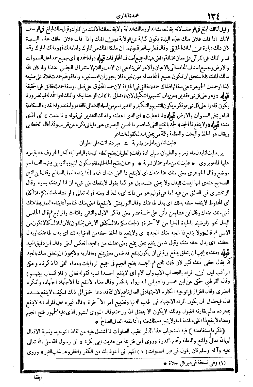 وَقيل: الْمَالِك أبلغ فِي الْوَصْف لِأَنَّهُ يُقَال: مَالك الدَّار وَمَالك الدَّابَّة، وَلَا يُقَال: ملك إِلَّا لملك من الْمُلُوك. وَقيل: ملك أبلغ فِي الْوَصْف لِأَنَّك إِذا قلت: فلَان ملك هَذِه الْبَلدة يكون كِنَايَة عَن الْولَايَة دون الْملك، وَإِذا قلت: فلَان مَالك هَذِه الْبَلدة كل ذَلِك عبارَة عَن الْملك الْحَقِيقِيّ. وَقَالَ قطرب: الْفرق بَينهمَا أَن ملكا الْملك من الْمُلُوك، وَأما مَالك فَهُوَ مَالك الْمُلُوك، وَقد فسر الْملك فِي الْقُرْآن على معَان مُخْتَلفَة، وَالْمعْنَى هَهُنَا: لَهُ جَمِيع أَصْنَاف الْمَخْلُوقَات. قَوْله: (وَله الْحَمد) ، أَي: جَمِيع حمد أهل السَّمَوَات وَالْأَرْض، وَجَمِيع أَصْنَاف المحامد الَّتِي بالأعيان والأعراض، بِنَاء على أَن الْألف وَاللَّام لاستغراق الْجِنْس عندنَا، وَلما كَانَ الله مَالك الْملك كُله اسْتحق أَن تكون جَمِيع المحامد لَهُ دون غَيره، فَلَا يجوز أَن يحمد غَيره. وَأما قَوْلهم: حمدت فلَانا على صَنِيعه كَذَا، أَو حمدت الْجَوْهَرَة على صفائها، فَذَاك حمد للخالق فِي الْحَقِيقَة، لِأَن حمد الْمَخْلُوق على فعل أَو صفة حمد للخالق فِي الْحَقِيقَة. قَوْله: (وَهُوَ على كل شَيْء قدير) ، من بَاب التتميم والتكميل، لِأَن الله تَعَالَى، لما كَانَت الوحدانية لَهُ وَالْملك لَهُ وَالْحَمْد لَهُ، فبالضرورة يكون قَادِرًا على كل شَيْء، وَذكره يكون للتتميم والتكميل، والقدير إسم من أَسمَاء الله تَعَالَى: كالقادر والمقتدر، وَله الْقُدْرَة الْكَامِلَة الباهرة فِي السَّمَوَات وَالْأَرْض قَوْله: (لما أَعْطَيْت) أَي: الَّذِي أَعْطيته، وَكَذَلِكَ التَّقْدِير فِي قَوْله: (لما منعت) أَي: الَّذِي منعته. قَوْله: (وَلَا ينفع ذَا الْجد) الْجد، بِالْفَتْح: الْغنى، كَمَا فسره الْحسن الْبَصْرِيّ على مَا يَأْتِي ذكره عَن قريب، وَكَذَا قَالَ الْخطابِيّ، وَيُقَال: هُوَ الْحَظ وَالْبخْت وَالْعَظَمَة، وَكلمَة: من، بِمَعْنى الْبَدَل، كَقَوْل الشَّاعِر: