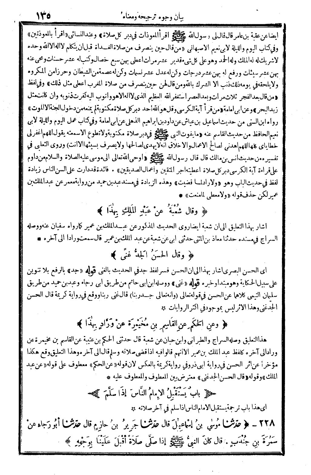 228 - (حَدثنَا مُوسَى بن إِسْمَاعِيل قَالَ حَدثنَا جرير بن حَازِم قَالَ حَدثنَا أَبُو رَجَاء عَن سَمُرَة بن جُنْدُب. قَالَ كَانَ النَّبِي - صَلَّى اللَّهُ عَلَيْهِ وَسَلَّم َ - إِذا صلى صَلَاة أقبل علينا بِوَجْهِهِ)