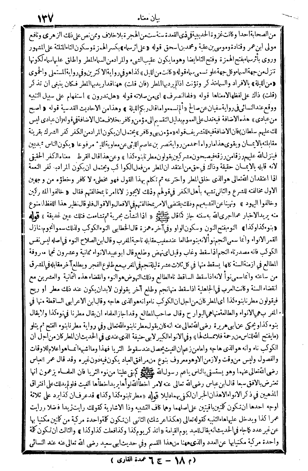من الصَّحَابَة أحدا، وَكَانَت غَزْوَة الْحُدَيْبِيَة فِي ذِي الْقعدَة سنة سِتّ من الْهِجْرَة بِلَا خلاف، وَمِمَّنْ نَص على ذَلِك الزُّهْرِيّ وَنَافِع مولى ابْن عمر وَقَتَادَة ومُوسَى بن عقبَة وَمُحَمّد بن إِسْحَاق. قَوْله: (على إِثْر سَمَاء) ، بِكَسْر الْهمزَة وَسُكُون الثَّاء الْمُثَلَّثَة على الْمَشْهُور، وَرُوِيَ، بأثر سَمَاء، بِفَتْح الْهمزَة وَفتح الثَّاء أَيْضا، وَهُوَ: مَا يكون عقيب الشَّيْء، وَالْمرَاد من السَّمَاء: الْمَطَر، وَأطلق عَلَيْهَا: سَمَاء، لكَونهَا تنزل من جِهَة السَّمَاء، وكل جِهَة علو تسمى: سَمَاء. قَوْله: (كَانَت من اللَّيْل) ، كَذَا هُوَ فِي رِوَايَة الْأَكْثَرين، وَفِي رِوَايَة الْمُسْتَمْلِي والحموي: (من اللَّيْلَة) بِالْإِفْرَادِ، وَالسَّمَاء تذكر وتؤنث إِذا لم يرد بهَا الْمَطَر. فَإِن قلت: هَهُنَا قد أُرِيد بهَا الْمَطَر، فَكَانَ يَنْبَغِي أَن تذكر؟ قلت: ذَاك على لَفظهَا لَا مَعْنَاهَا. قَوْله: (فَلَمَّا انْصَرف) أَي: من صلَاته. قَوْله: (هَل تَدْرُونَ؟) اسْتِفْهَام على سَبِيل التَّنْبِيه، وَوَقع عِنْد النَّسَائِيّ فِي رِوَايَة سُفْيَان عَن صَالح: (ألم تسمعوا مَا قَالَ ربكُم اللَّيْلَة؟) وَهَذَا من الْأَحَادِيث القدسية. قَوْله: (أصبح من عبَادي) ، هَذِه الْإِضَافَة فِيهِ تدل على الْعُمُوم بِدَلِيل التَّقْسِيم إِلَى مُؤمن وَكَافِر، بِخِلَاف مثل الْإِضَافَة فِي قَوْله: {إِن عبَادي لَيْسَ لَك عَلَيْهِم سُلْطَان} (الْحجر: 42، والإسراء: 65) . فَإِن الْإِضَافَة فِيهِ للتشريف. قَوْله: (مُؤمن بِي وَكَافِر) ، يحْتَمل أَن يكون المُرَاد من الْكفْر كفر الشّرك بِقَرِينَة مُقَابلَته بِالْإِيمَان، وَيُقَوِّي هَذَا مَا رَوَاهُ أَحْمد من رِوَايَة نصر بن عَاصِم اللَّيْثِيّ عَن مُعَاوِيَة اللَّيْثِيّ مَرْفُوعا: (يكون النَّاس مجدبين فَينزل الله عَلَيْهِم رزقا من رزقه، فيصبحون مُشْرِكين يَقُولُونَ: مُطِرْنَا بِنَوْء كَذَا) . وَعَن هَذَا قَالَ الْقُرْطُبِيّ: مَعْنَاهُ الْكفْر الْحَقِيقِيّ، لِأَنَّهُ قابله بِالْإِيمَان حَقِيقَة، وَذَاكَ فِي حق من اعْتقد أَن الْمَطَر من فعل الْكَوَاكِب، وَيحْتَمل أَن يكون المُرَاد بِهِ كفر النِّعْمَة إِذا اعْتقد أَن الله تَعَالَى هُوَ الَّذِي خلق الْمَطَر واخترعه، ثمَّ تكلم بِهَذَا القَوْل، فَهُوَ مخطىء لَا كَافِر، وخطؤه من وَجْهَيْن: الأول: مُخَالفَته للشَّرْع. وَالثَّانِي: تشبهه بِأَهْل الْكفْر فِي قَوْلهم، وَذَلِكَ لَا يجوز، لأَنا أمرنَا بمخالفتهم. فَقَالَ: (خالفوا الْمُشْركين وخالفوا الْيَهُود) ، ونهينا عَن التَّشَبُّه بهم، وَذَلِكَ يَقْتَضِي الْأَمر بمخالفتهم فِي الْأَفْعَال والأقوال، فَلَو قَالَ: نَظِير هَذَا اللَّفْظ الْمَمْنُوع مِنْهُ يُرِيد الْإِخْبَار عَمَّا أجْرى الله بِهِ سنته جَازَ، كَمَا قَالَ صلى الله عَلَيْهِ وَسلم: (إِذا أنشأت بحريّة ثمَّ تشاءمت فَتلك عين غديقة) . قَوْله: (بِنَوْء كَذَا وَكَذَا) ، النوء، بِفَتْح النُّون وَسُكُون الْوَاو وَفِي آخِره همزَة، قَالَ الْخطابِيّ: النوء: الْكَوْكَب، وَلذَلِك سموا نُجُوم منَازِل الْقَمَر: الأنواء، وَإِنَّمَا سمي النَّجْم نوأ لِأَنَّهُ ينوء طالعا عِنْد مغيب مُقَابِله نَاحيَة الْمغرب. وَقَالَ ابْن الصّلاح: النوء فِي أَصله لَيْسَ نفس الْكَوْكَب، فَإِنَّهُ مصدر: ناء النَّجْم إِذا سقط وَغَابَ، وَقيل: أَي نَهَضَ وطلع. وَقَالَ أَبُو عبيد: الأنواء ثَمَانِيَة وَعِشْرُونَ نجما مَعْرُوفَة الْمطَالع فِي أزمنة السّنة كلهَا، يسْقط مِنْهَا فِي كل ثَلَاث عشرَة لَيْلَة نجم فِي الْمغرب مَعَ طُلُوع الْفجْر، ويطلع آخر مُقَابِله فِي الْمشرق من سَاعَته، وَإِنَّمَا سمي نوأً لِأَنَّهُ إِذا سقط السَّاقِط ناء الطالع، وَذَلِكَ النهوض هُوَ النوء، وانقضاء هَذِه الثَّمَانِية وَالْعِشْرين مَعَ انْقِضَاء السّنة، وَكَانَت الْعَرَب فِي الْجَاهِلِي