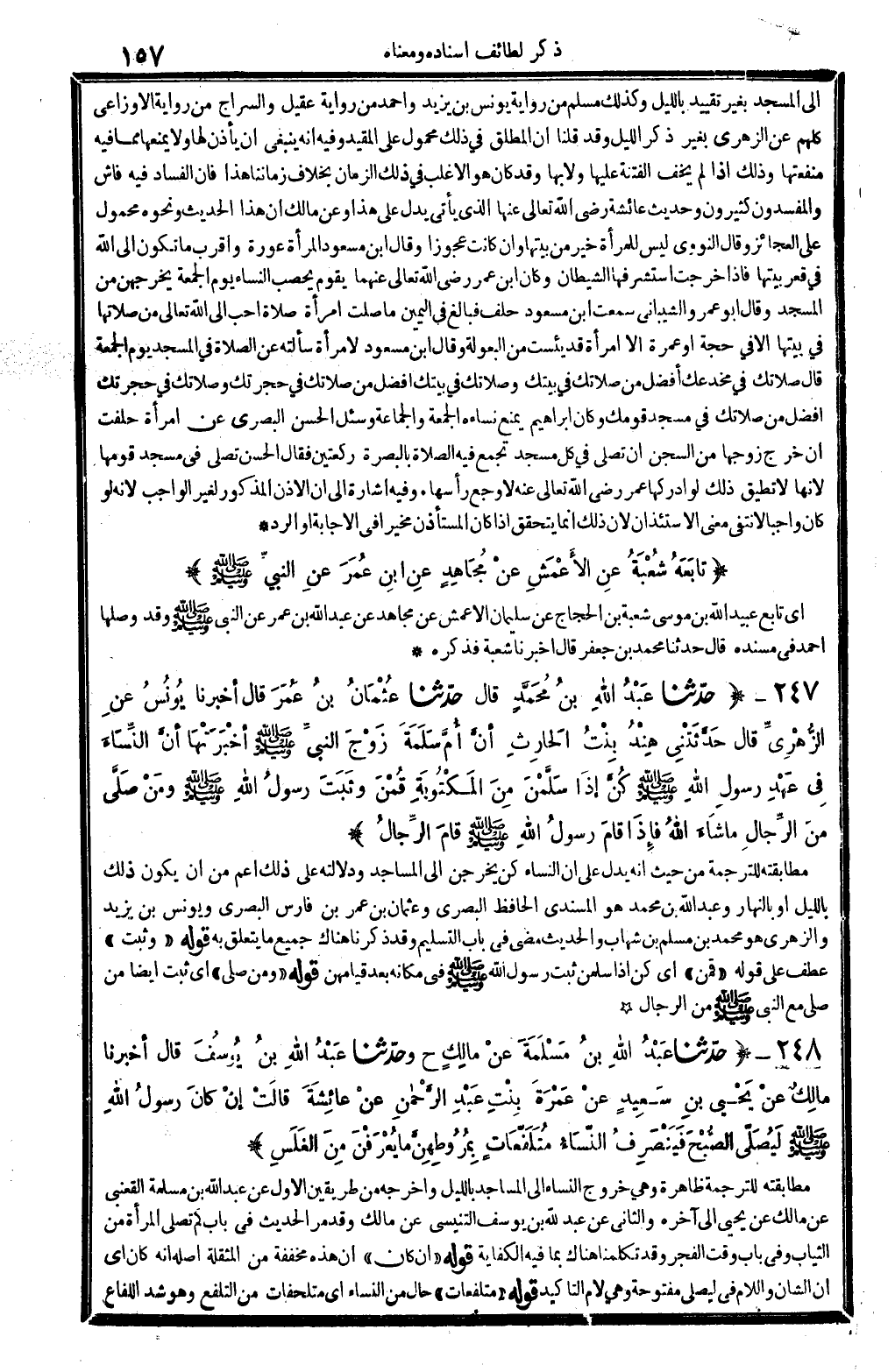 إِلَى الْمَسْجِد، بِغَيْر تَقْيِيد بِاللَّيْلِ، وَكَذَلِكَ مُسلم من رِوَايَة يُونُس ين يزِيد، وَأحمد من رِوَايَة عقيل والسراج من رِوَايَة الْأَوْزَاعِيّ كلهم عَن الزُّهْرِيّ بِغَيْر ذكر اللَّيْل، وَقد قُلْنَا: إِن الْمُطلق فِي ذَلِك مَحْمُول على الْمُقَيد، وَفِيه أَنه يَنْبَغِي أَن يَأْذَن لَهَا وَلَا يمْنَعهَا مِمَّا فِيهِ مَنْفَعَتهَا، وَذَلِكَ إِذا لم يخف الْفِتْنَة عَلَيْهَا وَلَا بهَا، وَقد كَانَ هُوَ الْأَغْلَب فِي ذَلِك الزَّمَان بِخِلَاف زَمَاننَا هَذَا، فَإِن الْفساد فِيهِ فاشٍ والمفسدون كَثِيرُونَ. وَحَدِيث عَائِشَة، رَضِي الله تَعَالَى عَنْهَا، الَّذِي يَأْتِي يدل على هَذَا، وَعَن مَالك: إِن هَذَا الحَدِيث وَنَحْوه مَحْمُول على الْعَجَائِز. وَقَالَ النَّوَوِيّ: لَيْسَ للْمَرْأَة خير من بَيتهَا وَإِن كَانَت عجوزا. وَقَالَ ابْن مَسْعُود: الْمَرْأَة عَورَة، وَأقرب مَا تكون إِلَى الله فِي قَعْر بَيتهَا، فَإِذا خرجت استشرفها الشَّيْطَان. وَكَانَ ابْن عمر، رَضِي الله تَعَالَى عَنْهُمَا، يقوم يحصب النِّسَاء يَوْم الْجُمُعَة يخرجهن من الْمَسْجِد. وَقَالَ أَبُو عَمْرو الشَّيْبَانِيّ: سَمِعت ابْن مَسْعُود حلف فَبَالغ فِي الْيَمين: مَا صلت امْرَأَة صَلَاة أحب إِلَى الله تَعَالَى من صلَاتهَا فِي بَيتهَا إلاّ فِي حجَّة أَو عمْرَة، إِلَّا امْرَأَة قد يئست من البعولة. وَقَالَ ابْن مَسْعُود لامْرَأَة سَأَلته عَن الصَّلَاة فِي الْمَسْجِد يَوْم الْجُمُعَة، قَالَ: صَلَاتك فِي مخدعك أفضل من صَلَاتك فِي بَيْتك، وصلاتك فِي بَيْتك أفضل من صَلَاتك فِي حجرتك، وصلاتك فِي حجرتك أفضل من صَلَاتك فِي مَسْجِد قَوْمك. وَكَانَ إِبْرَاهِيم يمْنَع نِسَاءَهُ الْجُمُعَة وَالْجَمَاعَة. وَسُئِلَ الْحسن الْبَصْرِيّ عَن امْرَأَة حَلَفت إِن خرج زَوجهَا من السجْن أَن تصلي فِي كل مَسْجِد تجمع فِيهِ الصَّلَاة بِالْبَصْرَةِ رَكْعَتَيْنِ،، فَقَالَ الْحسن: تصلي فِي مَسْجِد قَومهَا لِأَنَّهَا لَا تطِيق ذَلِك،، لَو أدْركهَا عمر، رَضِي الله تَعَالَى عَنهُ، لأوجع رَأسهَا.