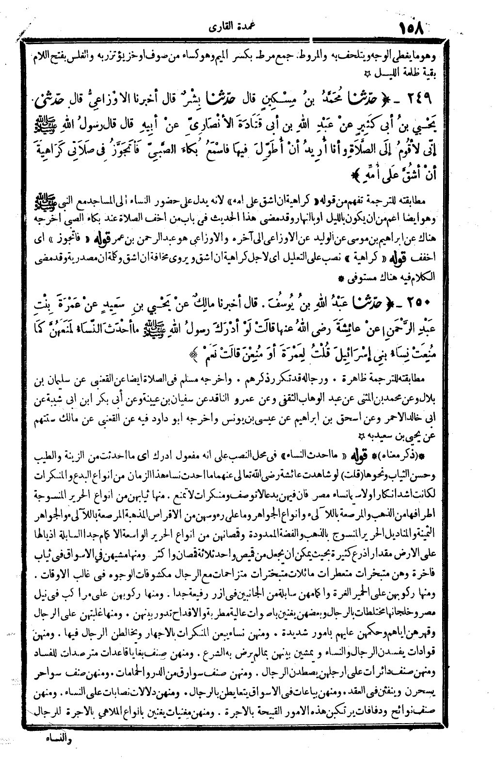 250 - (حَدثنَا عبد الله بن يُوسُف. قَالَ أخبرنَا مَالك عَن يحيى بن سعيد عَن عمْرَة بنت عبد الرَّحْمَن عَن عَائِشَة رَضِي الله عَنْهَا قَالَت لَو أدْرك رَسُول الله - صَلَّى اللَّهُ عَلَيْهِ وَسَلَّم َ - مَا أحدث النِّسَاء لمنعهن كَمَا منعت نسَاء بني إِسْرَائِيل قلت لعمرة أَو منعن قَالَت نعم) مطابقته للتَّرْجَمَة ظَاهِرَة. وَرِجَاله تكَرر ذكرهم. وَأخرجه مُسلم فِي الصَّلَاة أَيْضا عَن القعْنبِي عَن سُلَيْمَان بن بِلَال وَعَن مُحَمَّد بن الْمثنى عَن عبد الْوَهَّاب الثَّقَفِيّ وَعَن عَمْرو النَّاقِد عَن سُفْيَان بن عُيَيْنَة وَعَن أبي بكر بن أبي شيبَة عَن أبي خَالِد الْأَحْمَر وَعَن اسحق بن إِبْرَاهِيم عَن عِيسَى بن يُونُس وَأخرجه أَبُو دَاوُد فِيهِ عَن القعْنبِي عَن مَالك ستتهم عَن يحيى بن سعيد بِهِ (ذكر مَعْنَاهُ) قَوْله " مَا أحدث النِّسَاء " فِي مَحل النصب على أَنه مفعول أدْرك أَي مَا أحدثت من الزِّينَة وَالطّيب وَحسن الثِّيَاب وَنَحْوهَا (قلت) لَو شاهدت عَائِشَة رَضِي الله تَعَالَى عَنْهُمَا مَا أحدث نسَاء هَذَا الزَّمَان من أَنْوَاع الْبدع والمنكرات لكَانَتْ أَشد إنكارا وَلَا سِيمَا نسَاء مصر فَإِن فِيهِنَّ بدعا لَا تُوصَف ومنكرات لَا تمنع. مِنْهَا ثيابهن من أَنْوَاع الْحَرِير المنسوجة أطرافها من الذَّهَب والمرصعة باللآلىء وأنواع الْجَوَاهِر وَمَا على رءوسهن من الأقراص المذهبة المرصعة باللآلىء والجواهر الثمينة والمناديل الْحَرِير المنسوج بِالذَّهَب وَالْفِضَّة الممدودة وقمصانهن من أَنْوَاع الْحَرِير الواسعة الأكمام جدا السابلة أذيالها على الأَرْض مِقْدَار أَذْرع كَثِيرَة بِحَيْثُ يُمكن أَن يَجْعَل من قَمِيص وَاحِد ثَلَاثَة قمصان وَأكْثر وَمِنْهَا مشيهن فِي الْأَسْوَاق فِي ثِيَاب فاخرة وَهن متبخترات متعطرات مائلات متبخترات متزاحمات مَعَ الرِّجَال مكشوفات الْوُجُوه فِي غَالب الْأَوْقَات. وَمِنْهَا ركوبهن على الْحمير الْغرَّة وأكمامهن سابلة من الْجَانِبَيْنِ فِي أزر رفيعة جدا. وَمِنْهَا ركوبهن على مراكب فِي نيل مصر وخلجانها مختلطات بِالرِّجَالِ وبعضهن يغنين بِأَصْوَات عالية مطربة والأقداح تَدور بَينهُنَّ. وَمِنْهَا غلبتهن على الرِّجَال وقهرهن إيَّاهُم وحكمهن عَلَيْهِم بِأُمُور شَدِيدَة. ومنهن نسَاء يبعن الْمُنْكَرَات بالإجهار ويخالطن الرِّجَال فِيهَا. ومنهن قوادات يفسدن الرِّجَال وَالنِّسَاء ويمشين بَينهُنَّ بِمَا لم يرض بِهِ الشَّرْع. ومنهن صنف بَغَايَا قاعدات مترصدات للْفَسَاد ومنهن صنف دائرات على أرجلهن يصطدن الرِّجَال. ومنهن نصف سوارق من الدّرّ والحمامات. ومنهن صنف سواحر يسحرن وينفثن فِي العقد ومنهن بياعات فِي الْأَسْوَاق يتعايطن بِالرِّجَالِ. ومنهن دلالات نصابات على النِّسَاء. ومنهن صنف نوائح ودفافات يرتكبن هَذِه الْأُمُور القبيحة بِالْأُجْرَةِ. ومنهن مغنيات يغنين بأنواع الملاهي بِالْأُجْرَةِ للرِّجَال