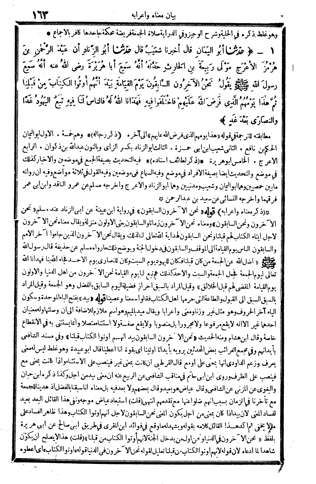 1 - (حَدثنَا أَبُو الْيَمَان قَالَ أخبرنَا شُعَيْب قَالَ حَدثنَا أَبُو الزِّنَاد أَن عبد الرَّحْمَن بن هُرْمُز الْأَعْرَج مولى ربيعَة بن الْحَارِث حَدثهُ أَنه سمع أَبَا هُرَيْرَة رَضِي الله عَنهُ أَنه سمع رَسُول الله - صَلَّى اللَّهُ عَلَيْهِ وَسَلَّم َ - يَقُول نَحن الْآخرُونَ السَّابِقُونَ يَوْم الْقِيَامَة بيد أَنهم أُوتُوا الْكتاب من قبلنَا ثمَّ هَذَا يومهم الَّذِي فرض الله عَلَيْهِم فَاخْتَلَفُوا فِيهِ فهدانا الله لَهُ فَالنَّاس لنا فِيهِ تبع الْيَهُود غَدا وَالنَّصَارَى بعد غَد) مطابقته للتَّرْجَمَة فِي قَوْله " هَذَا يومهم الَّذِي فرض الله عَلَيْهِم " إِلَى آخِره. (ذكر رِجَاله) وهم خَمْسَة. الأول أَبُو الْيَمَان الحكم بن نَافِع. الثَّانِي شُعَيْب ابْن أبي حَمْزَة. الثَّالِث أَبُو الزِّنَاد بِكَسْر الزَّاي وبالنون عبد الله بن ذكْوَان. الرَّابِع الْأَعْرَج. الْخَامِس أَبُو هُرَيْرَة. (ذكر لطائف إِسْنَاده) فِيهِ التحديث بِصِيغَة الْجمع فِي موضِعين والإخبار كَذَلِك فِي مَوضِع والتحديث أَيْضا بِصِيغَة الْإِفْرَاد فِي مَوضِع وَفِيه السماع فِي موضِعين وَفِيه القَوْل فِي ثَلَاثَة مَوَاضِع وَفِيه أَن رُوَاته مَا بَين حمصيين وهما أَبُو الْيَمَان وَشُعَيْب ومدنيين وهما أَبُو الزِّنَاد والأعرج وَأخرجه مُسلم عَن عَمْرو النَّاقِد وَابْن أبي عمر فرقهما وَأخرجه النَّسَائِيّ عَن سعيد بن عبد الرَّحْمَن (ذكر مَعْنَاهُ وَإِعْرَابه) قَوْله " نَحن الْآخرُونَ السَّابِقُونَ " فِي رِوَايَة ابْن عُيَيْنَة عَن أبي الزِّنَاد عِنْد مُسلم " نَحن الْآخرُونَ وَنحن السَّابِقُونَ " وَمَعْنَاهُ نَحن الْآخرُونَ زَمَانا وَالسَّابِقُونَ يَعْنِي الْأَولونَ منزلَة وَيُقَال مَعْنَاهُ نَحن الْآخرُونَ لأجل إيتَاء الْكتاب لَهُم قبلنَا وَنحن السَّابِقُونَ لهداية الله تَعَالَى لنا لذَلِك وَيُقَال نَحن الْآخرُونَ الَّذين جَاءُوا آخر الْأُمَم وَالسَّابِقُونَ النَّاس يَوْم الْقِيَامَة إِلَى الْموقف وَالسَّابِقُونَ فِي دُخُول الْجنَّة ويوضح ذَلِك مَا رَوَاهُ مُسلم عَن حُذَيْفَة قَالَ رَسُول الله - صَلَّى اللَّهُ عَلَيْهِ وَسَلَّم َ - " أضلّ الله عَن الْجُمُعَة من كَانَ قبلنَا فَكَانَ للْيَهُود يَوْم السبت وَكَانَ لِلنَّصَارَى يَوْم الْأَحَد فجَاء الله بِنَا فهدانا الله تَعَالَى ليَوْم الْجُمُعَة فَجعل الْجُمُعَة والسبت والأحد كَذَلِك هم تبع لنا يَوْم الْقِيَامَة نَحن الْآخرُونَ من أهل الدُّنْيَا والأولون يَوْم الْقِيَامَة المقضى لَهُم قبل الْخَلَائق " وَقيل المُرَاد بِالسَّبقِ إِحْرَاز فَضِيلَة الْيَوْم السَّابِق بِالْفَضْلِ وَهُوَ الْجُمُعَة وَقيل المُرَاد بِالسَّبقِ السَّبق إِلَى الْقبُول وَالطَّاعَة الَّتِي حرمهَا أهل الْكتاب فَقَالُوا سمعنَا وعصينا قَوْله " بيد " بِفَتْح الْبَاء الْمُوَحدَة وَسُكُون الْيَاء آخر الْحُرُوف وَهُوَ مثل غير وزنا وَمعنى وإعرابا وَيُقَال ميد بِالْمِيم وَهُوَ اسْم ملازم للإضافة إِلَى أَن وصلتها وَله مَعْنيانِ أَحدهمَا غير إِلَّا أَنه لَا يَقع مَرْفُوعا وَلَا مجرورا بل مَنْصُوبًا وَلَا يَقع صفة وَلَا اسْتثِْنَاء مُتَّصِلا وَإِنَّمَا يسْتَثْنى بِهِ فِي الِانْقِطَاع خَاصَّة وَقَالَ ابْن هِشَام وَمِنْه الحَدِيث " نَحن الْآخرُونَ السَّابِقُونَ بيد أَنهم أُوتُوا الْكتاب قبلنَا " وَفِي مُسْند الشَّافِعِي بأيد أَنهم وَفِي مجمع الغرائب بعض الْمُحدثين يرويهِ بأيدانا أوتينا أَي بِقُوَّة إِنَّا أعطينا قَالَ أَبُو عُبَيْدَة وَهُوَ غلط لَيْسَ لَهُ معنى يعرف وَزعم الدَّاودِيّ أَنَّهَا بِمَعْنى على أَو مَعَ قَالَ الْقُرْطُبِيّ إِن كَانَت بِمَعْنى غير فينصب على الِاسْتِثْنَاء وَإِذا كَانَت بِمَعْنى مَعَ فينصب على الظّرْف وروى ابْن أبي حَاتِم فِي مَنَاقِب الشَّافِعِي عَن الرّبيع عَنهُ أَن معنى بيد من أجل وَكَذَا ذكره اب