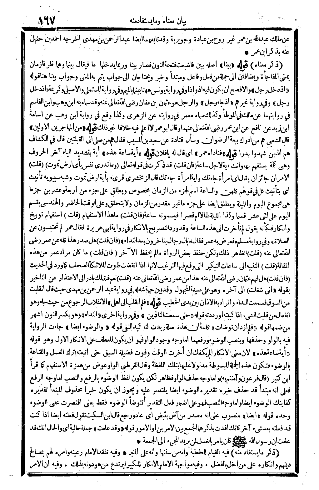 ذكر مَعْنَاهُ: قَوْله: (بَينا) أَصله: بَين، فأشبعت فَتْحة النُّون فَصَارَ: بَينا، وَرُبمَا يدخلهَا: مَا، فَيُقَال: بَيْنَمَا، وهما ظرفا زمَان بِمَعْنى المفاجأة، ويضافان إِلَى جملَة من فعل وفاعل ومبتدأ وَخبر، ويحتاجان إِلَى جَوَاب يتم بِهِ الْمَعْنى، وَجَوَاب: بَينا، هُنَا قَوْله: (إِذا دخل رجل) ، والأفصح أَن يكون فِيهِ: إِذْ وَإِذا، وَفِي رِوَايَة يُونُس هَهُنَا: بَيْنَمَا، بِالْمِيم، وَفِي رِوَايَة الْمُسْتَمْلِي والأصيلي وكريمة: (إِذْ دخل رجل) ، وَفِي رِوَايَة غَيرهم: (إِذْ جَاءَ رجل) ، وَالرجل هُوَ: عُثْمَان بن عَفَّان، رَضِي الله تَعَالَى عَنهُ، وَقد سَمَّاهُ بِهِ ابْن وهب وَابْن الْقَاسِم فِي روايتهما عَن مَالك فِي (الْمُوَطَّأ) ، وَكَذَلِكَ سَمَّاهُ معمر فِي رِوَايَته عَن الزُّهْرِيّ، وَكَذَا وَقع فِي رِوَايَة ابْن وهب عَن أُسَامَة ابْن زيد عَن نَافِع عَن ابْن عمر، رَضِي الله تَعَالَى عَنْهُمَا. وَقَالَ أَبُو عمر: لَا أعلم فِيهِ خلافًا غير ذَلِك. قَوْله: (من الْمُهَاجِرين الْأَوَّلين) قَالَ الشّعبِيّ: هم من أدْرك بيعَة الرضْوَان، وَسَأَلَ قَتَادَة عَن سعيد بن الْمسيب فَقَالَ: هم من صلى إِلَى الْقبْلَتَيْنِ. قَالَ فِي (الْكَشَّاف) : هم الَّذين شهدُوا بَدْرًا. قَوْله: (فناداه عمر) ، أَي: قَالَ لَهُ: يَا فلَان. قَوْله: (أَيَّة سَاعَة هَذِه) أَيَّة، بتَشْديد الْيَاء آخر الْحُرُوف، وَهِي كلمة يستفهم بهَا، وأنث: أَيَّة، لأجل: سَاعَة. فَإِن قلت: قد ذكرت فِي قَوْله تَعَالَى: {وَمَا تَدْرِي نفس بِأَيّ أَرض تَمُوت} (لُقْمَان: 34) . قلت: الْأَمْرَانِ جائزان، يُقَال: أَي امْرَأَة جاءتك، وأية امْرَأَة جاءتك. قَالَ الزَّمَخْشَرِيّ: قرىء: بأية أَرض تَمُوت، وَشبه سِيبَوَيْهٍ تَأْنِيث: أَ، بتأنيث: كل، فِي قَوْلهم: كُلهنَّ، والساعة اسْم لجزء من الزَّمَان مَخْصُوص، وَيُطلق على جُزْء من أَرْبَعَة وَعشْرين جُزْءا هِيَ مَجْمُوع الْيَوْم وَاللَّيْلَة، وَيُطلق أَيْضا على جُزْء مَا غير مُقَدّر من الزَّمَان، وَلَا يتَحَقَّق. وعَلى الْوَقْت الْحَاضِر والهندسي بقسم الْيَوْم على اثْنَي عشر قسما، وَكَذَا اللَّيْلَة طالا أم قصرا، فيسمونه: سَاعَة. فَإِن قلت: مَا هَذَا الِاسْتِفْهَام؟ قلت: اسْتِفْهَام توبيخ وإنكار، فَكَأَنَّهُ يَقُول: لم تَأَخَّرت إِلَى هَذِه السَّاعَة؟ وَقد ورد التَّصْرِيح بالإنكار فِي رِوَايَة أبي هُرَيْرَة، فَقَالَ عمر: (لم تحتبسون عَن الصَّلَاة؟) وَفِي رِوَايَة مُسلم: (فَعرض بِهِ عمر، فَقَالَ: مَا بَال رجال يتأخرون بعد النداء؟) فَإِن قلت: هَل صدر هَذَا كُله عَن عمر، رَضِي الله تَعَالَى عَنهُ؟ قلت: الظَّاهِر ذَلِك، وَلَكِن حفظ بعض الروَاة مَا لم يحفظ الآخر. فَإِن قلت: مَا كَانَ مُرَاد عمر من هَذِه الْمقَالة؟ قلت: التَّنْبِيه إِلَى سَاعَات التبكير الَّتِي وَقع فِيهَا التَّرْغِيب، لِأَنَّهَا إِذا انْقَضتْ طوت الْمَلَائِكَة الصُّحُف، كَمَا ورد فِي الحَدِيث. فَإِن قلت: هَل فهم عُثْمَان، رَضِي الله تَعَالَى عَنهُ، هَذَا من عمر، رَضِي الله تَعَالَى عَنهُ؟ قلت: نعم، فَلذَلِك بَادر إِلَى الِاعْتِذَار عَن التَّأْخِير بقوله: (إِنِّي شغلت) إِلَى آخِره، وَهُوَ على صِيغَة الْمَجْهُول، وَقد بَين شغله فِي رِوَايَة عبد الرَّحْمَن بن مهْدي حَيْثُ قَالَ: انقلبت من السُّوق فَسمِعت النداء، وَالْمرَاد بِهِ الْأَذَان بَين يَدي الْخَطِيب. قَوْله: (فَلم أنقلب إِلَى أَهلِي) الانقلاب: الرُّجُوع من حَيْثُ جَاءَ، وَهُوَ انفعال من: قلبت الشَّيْء إِذا كببته أوردته. قَوْله: (حَتَّى سَمِعت التأذين) ، وَفِي رِوَايَة أُخْرَى: (النداء) ، وَهُوَ بِكَسْر النُّون أشهر من ضمهَا. قَوْله: (فَلم أَزْد أَن تَوَضَّأت) كلمة: أَن، هَذِه صلَة زيدت لتأكيد النَّفْي. قَوْله: (وَالْوُضُوء أَيْضا؟) جَاءَت الرِّوَايَة فِيهِ بِالْوَاو وحذفها، وبنصب الْوضُوء ورفعهما. أما وَجه وجود الْوَاو فَهُوَ أَن 