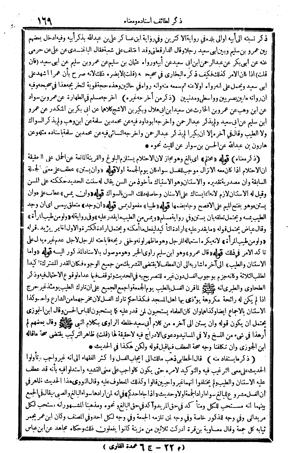 ذكر نسبته إِلَى أَبِيه أَو إِلَى بَلَده فِي رِوَايَة الْأَكْثَرين، وَفِي رِوَايَة ابْن عَسَاكِر: عَليّ بن عبد الله، بِذكر أَبِيه. وَفِيه: أَدخل بَعضهم بَين عَمْرو بن سليم وَبَين أبي سعيد رجلا، وَقَالَ الدَّارَقُطْنِيّ: وَقد اخْتلف على شُعْبَة، فَقَالَ الباغندي: عَن عَليّ عَن حرمي عَنهُ عَن أبي بكر عَن عبد الرَّحْمَن ابْن أبي سعيد عَن أَبِيه، وَرَوَاهُ عُثْمَان بن سليم: عَن عَمْرو بن سليم عَن أبي سعيد. فَإِن قلت: إِذا كَانَ الْأَمر كَذَلِك، فَكيف ذكره البُخَارِيّ فِي صَحِيحه؟ قلت: لَا يضرّهُ ذَلِك لِأَنَّهُ صرح بِأَن عمرا أشهد على أبي سعيد، وَيحمل على أَنه رَوَاهُ أَولا عَنهُ ثمَّ سَمعه مِنْهُ، وَأَنه رَوَاهُ فِي حالتين، وَهَذِه حجَّة قَوِيَّة لتخريجه هَذَا فِي صَحِيحه. وَفِيه: أَن رُوَاته مَا بَين بصريين وواسطي ومدنيين.