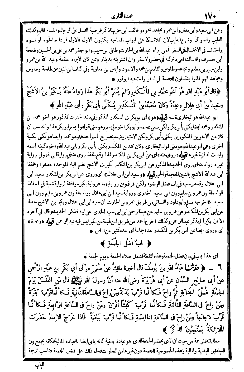 وَعَن أبي سعيد وَابْن مُغفل وَابْن عمر وَمُجاهد نَحوه، وَخَالف ابْن حزم لما ذكر فَرضِيَّة الْغسْل على الرِّجَال وَالنِّسَاء، قَالَ: وَكَذَلِكَ الطّيب والسواك، وَشرع الطّيب لِأَن الْمَلَائِكَة على أَبْوَاب الْمَسَاجِد يَكْتُبُونَ الأول فَالْأول، فَرُبمَا صافحوه أَو لمسوه. وَاخْتلف فِي الِاغْتِسَال فِي السّفر، فَمِمَّنْ يرَاهُ؛ عبد الله بن الْحَارِث وطلق بن حبيب وَأَبُو جَعْفَر مُحَمَّد بن عَليّ بن الْحُسَيْن وَطَلْحَة ابْن مصرف. وَقَالَ الشَّافِعِي: مَا تركته فِي حضر وَلَا سفر وَإِن اشْتَرَيْته بِدِينَار، وَمِمَّنْ كَانَ لَا يرَاهُ: عَلْقَمَة وَعبد الله بن عَمْرو وَابْن جُبَير بن مطعم وَمُجاهد وطاووس وَالقَاسِم بن مُحَمَّد وَالْأسود وَإيَاس بن مُعَاوِيَة. وَفِي كتاب ابْن التِّين عَن طَلْحَة وطاووس وَمُجاهد أَنهم كَانُوا يغتسلون للْجُمُعَة فِي السّفر، واستحبه أَبُو ثَوْر.