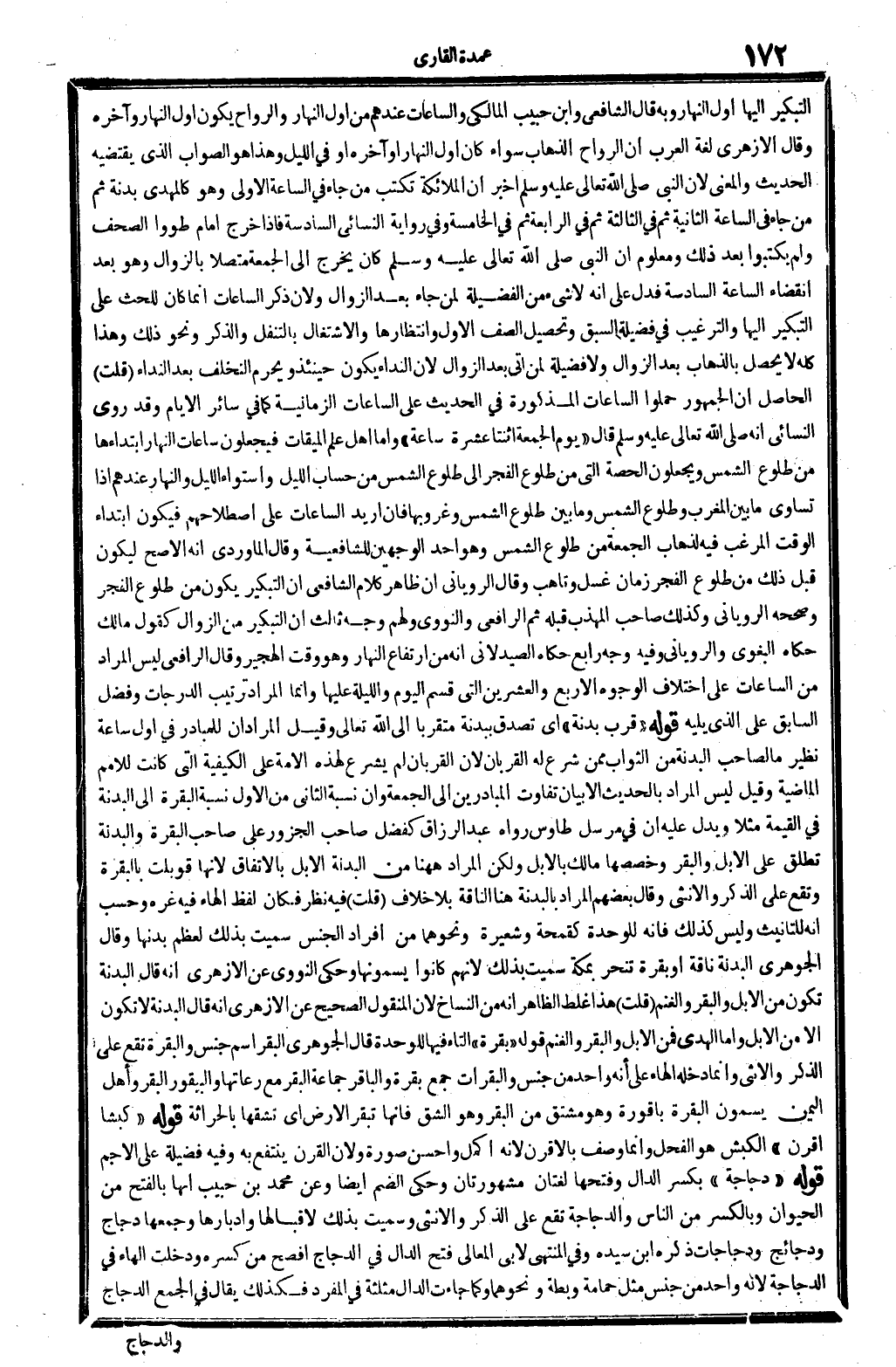 التبكير إِلَيْهَا أول النَّهَار، وَبِه قَالَ الشَّافِعِي وَابْن حبيب الْمَالِكِي، والساعات عِنْدهم من أول النَّهَار، والرواح يكون أول النَّهَار وَآخره. وَقَالَ الْأَزْهَرِي: لُغَة الْعَرَب أَن الرواح: الذّهاب، سَوَاء كَانَ أول النَّهَار أَو آخِره أَو فِي اللَّيْل، وَهَذَا هُوَ الصَّوَاب الَّذِي يَقْتَضِيهِ الحَدِيث، وَالْمعْنَى: لِأَن النَّبِي صلى الله عَلَيْهِ وَسلم، أخبر أَن الْمَلَائِكَة تكْتب من جَاءَ فِي السَّاعَة الأولى وَهُوَ كالمهدي بَدَنَة، ثمَّ من جَاءَ فِي السَّاعَة الثَّانِيَة، ثمَّ فِي الثَّالِثَة، ثمَّ فِي الرَّابِعَة، ثمَّ فِي الْخَامِسَة، وَفِي رِوَايَة النَّسَائِيّ: السَّادِسَة، فَإِذا خرج إِمَام طَوَوْا الصُّحُف وَلم يكتبوا بعد ذَلِك. وَمَعْلُوم أَن النَّبِي، صلى الله عَلَيْهِ وَسلم، كَانَ يخرج إِلَى الْجُمُعَة مُتَّصِلا بالزوال، وَهُوَ بعد انْقِضَاء السَّاعَة السَّادِسَة، فَدلَّ على أَنه لَا شَيْء من الْفَضِيلَة لمن جَاءَ بعد الزَّوَال، وَلِأَن ذكر السَّاعَات إِنَّمَا كَانَ للحث على التبكير إِلَيْهَا وَالتَّرْغِيب فِي فَضِيلَة السَّبق وَتَحْصِيل الصَّفّ الأول وانتظارها والاشتغال بالتنفل وَالذكر، وَنَحْو ذَلِك، وَهَذَا كُله لَا يحصل بالذهاب بعد الزَّوَال، وَلَا فَضِيلَة لمن أَتَى بعد الزَّوَال لِأَن النداء يكون حِينَئِذٍ، وَيحرم التَّخَلُّف بعد النداء. قلت: الْحَاصِل أَن الْجُمْهُور حملُوا السَّاعَات الْمَذْكُورَة فِي الحَدِيث على السَّاعَات الزمانية، كَمَا فِي سَائِر الْأَيَّام، وَقد روى النَّسَائِيّ أَنه، صلى الله عَلَيْهِ وَسلم، قَالَ: (يَوْم الْجُمُعَة اثْنَتَا عشرَة سَاعَة) ، وَأما أهل علم الْمِيقَات فيجعلون سَاعَات النَّهَار ابتداءها من طُلُوع الشَّمْس، ويجعلون الْحصَّة الَّتِي من طُلُوع الْفجْر إِلَى طُلُوع الشَّمْس من حِسَاب اللَّيْل، واستواء اللَّيْل وَالنَّهَار عِنْدهم إِذا تساوى مَا بَين الْمغرب وطلوع الشَّمْس، وَمَا بَين طُلُوع الشَّمْس وغروبها، فَإِن أُرِيد السَّاعَات على اصطلاحهم فَيكون ابْتِدَاء الْوَقْت المرغب فِيهِ لذهاب الْجُمُعَة من طُلُوع الشَّمْس، وَهُوَ أحد الْوَجْهَيْنِ للشَّافِعِيَّة. وَقَالَ الْمَاوَرْدِيّ: إِنَّه الْأَصَح، ليَكُون قبل ذَلِك من طُلُوع الْفجْر زمَان غسل وتأهب. وَقَالَ الرَّوْيَانِيّ: إِن ظَاهر كَلَام الشَّافِعِي أَن التبكير يكون من طُلُوع الْفجْر، وَصَححهُ الرَّوْيَانِيّ، وَكَذَلِكَ صَاحب (الْمُهَذّب) قبله، ثمَّ الرَّافِعِيّ وَالنَّوَوِيّ، وَلَهُم وَجه ثَالِث: إِن التبكير من الزَّوَال كَقَوْل مَالك، حَكَاهُ الْبَغَوِيّ وَالرُّويَانِيّ. وَفِيه وَجه رَابِع حَكَاهُ الصيدلاني: إِنَّه من ارْتِفَاع النَّهَار، وَهُوَ وَقت الهجير. وَقَالَ الرَّافِعِيّ: لَيْسَ المُرَاد من السَّاعَات على اخْتِلَاف الْوُجُوه الْأَرْبَع وَالْعِشْرين الَّتِي قسم الْيَوْم وَاللَّيْلَة عَلَيْهَا، وَإِنَّمَا المُرَاد تَرْتِيب الدَّرَجَات وَفضل السَّابِق على الَّذِي يَلِيهِ. قَوْله: (قرب بَدَنَة) أَي: تصدق ببدنة متقربا إِلَى الله تَعَالَى، وَقيل: المُرَاد أَن للمبادر فِي أول سَاعَة نَظِير مَا لصَاحب الْبَدنَة من الثَّوَاب مِمَّن شرع لَهُ القربان، لِأَن القربان لم يشرع لهَذِهِ الْأمة على الْكَيْفِيَّة الَّتِي كَانَت للأمم الْمَاضِيَة. وَقيل: لَيْسَ المُرَاد بِالْحَدِيثِ إلاّ بَيَان تفَاوت المبادرين إِلَى الْجُمُعَة، وَأَن نِسْبَة الثَّانِي من الأول نِسْبَة الْبَقَرَة إِلَى الْبَدنَة فِي الْقيمَة مثلا، وَيدل عَلَيْهِ أَن فِي مُرْسل طَاوُوس، رَوَاهُ عبد الرَّزَّاق: كفضل صَاحب الْجَزُور على صَاحب الْبَقَرَة، والبدنة تطلق على الْإِبِل وَالْبَقر، وخصصها مَالك بِالْإِبِلِ، وَلَكِن المُرَاد هَهُنَا من الْبَدنَة الْإِبِل بالِاتِّفَاقِ، لِأَنَّهَا قوبلت ب