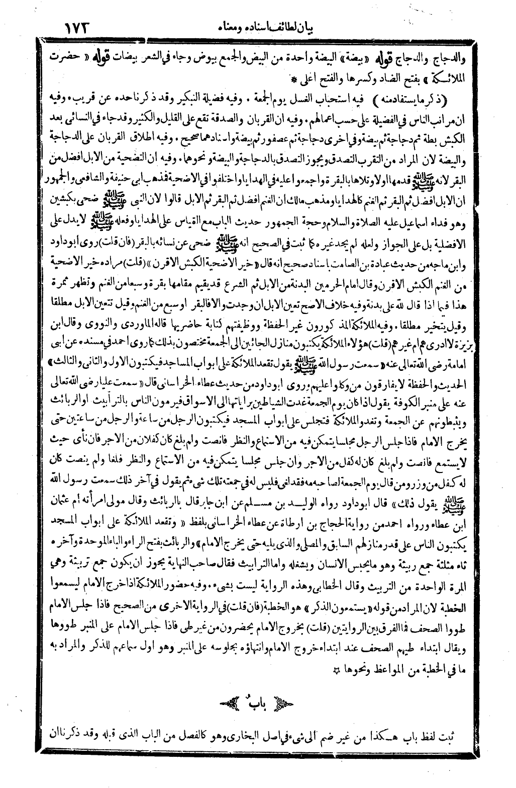 ذكر مَا يُسْتَفَاد مِنْهُ: فِيهِ: اسْتِحْبَاب الْغسْل يَوْم الْجُمُعَة. وَفِيه: فَضِيلَة التبكير، وَقد ذكرنَا حَده عَن قريب. وَفِيه: أَن مَرَاتِب النَّاس فِي الْفَضِيلَة على حسب أَعْمَالهم. وَفِيه: أَن القربان وَالصَّدَََقَة تقع على الْقَلِيل وَالْكثير، وَقد جَاءَ فِي النَّسَائِيّ بعد الْكَبْش: بطة ثمَّ دجَاجَة ثمَّ بَيْضَة، وَفِي أُخْرَى: دجَاجَة ثمَّ عُصْفُور ثمَّ بَيْضَة، وإسنادهما صَحِيح. وَفِيه: إِطْلَاق القربان على الدَّجَاجَة والبيضة لِأَن المُرَاد من التَّقَرُّب التَّصَدُّق، وَيجوز التَّصَدُّق بالدجاجة والبيضة وَنَحْوهمَا. وَفِيه: أَن التَّضْحِيَة من الْإِبِل أفضل من الْبَقر لِأَن صلى الله عَلَيْهِ وَسلم قدمهَا أَولا وتلاها بالبقرة، وَأَجْمعُوا عَلَيْهِ فِي الْهَدَايَا وَاخْتلفُوا فِي الْأُضْحِية فمذهب أبي حنيفَة وَالشَّافِعِيّ وَالْجُمْهُور: أَن الْإِبِل أفضل ثمَّ الْبَقر ثمَّ الْغنم كالهدايا، وَمذهب مَالك: أَن الْغنم أفضل ثمَّ الْبَقر ثمَّ الْإِبِل، قَالُوا: لِأَن النَّبِي صلى الله عَلَيْهِ وَسلم ضحى بكبشين وَهُوَ فدَاء إِسْمَاعِيل، عَلَيْهِ الصَّلَاة وَالسَّلَام، وَحجَّة الْجُمْهُور حَدِيث الْبَاب مَعَ الْقيَاس على الْهَدَايَا، وَفعله صلى الله عَلَيْهِ وَسلم لَا يدل على الْأَفْضَلِيَّة بل على الْجَوَاز، وَلَعَلَّه لم يجد غَيره، كَمَا ثَبت فِي (الصَّحِيح) أَنه صلى الله عَلَيْهِ وَسلم: ضحى عَن نِسَائِهِ بالبقرة. فَإِن قلت: روى أَبُو دَاوُد وَابْن مَاجَه من حَدِيث عبَادَة بن الصَّامِت بِإِسْنَاد صَحِيح أَنه قَالَ: (خير الْأُضْحِية الْكَبْش الأقرن) . قلت: مُرَاده خير الْأُضْحِية من الْغنم الْكَبْش الأقرن، وَقَالَ إِمَام الْحَرَمَيْنِ: الْبَدنَة من الْإِبِل ثمَّ الشَّرْع قد يُقيم مقَامهَا بقرة وَسبعا من الْغنم، وَتظهر ثَمَرَة هَذَا فِيمَا إِذا قَالَ: لله عَليّ بَدَنَة، وَفِيه خلاف، الْأَصَح تعين الْإِبِل إِن وجدت، وإلاّ فالبقر أَو سبع من الْغنم، وَقيل: تتَعَيَّن الْإِبِل مُطلقًا وَقيل يتَخَيَّر مُطلقًا. وَفِيه: الْمَلَائِكَة المذكورون غير الْحفظَة، ووظيفتهم كِتَابَة حاضريها، قَالَه الْمَاوَرْدِيّ وَالنَّوَوِيّ، وَقَالَ ابْن بزيزة: لَا أَدْرِي هم أم غَيرهم؟ قلت: هَؤُلَاءِ الْمَلَائِكَة يَكْتُبُونَ منَازِل الجائين إِلَى الْجُمُعَة مختصون بذلك، كَمَا روى أَحْمد فِي (مُسْنده) : عَن أبي أُمَامَة، رَضِي الله تَعَالَى عَنهُ: (سَمِعت رَسُول الله صلى الله عَلَيْهِ وَسلم يَقُول: تقعد الْمَلَائِكَة على أَبْوَاب الْمَسَاجِد فيكتبون الأول وَالثَّانِي وَالثَّالِث. .) الحَدِيث، والحفظة لَا يفارقون من وكلوا عَلَيْهِم، وروى أَبُو دَاوُد من حَدِيث عَطاء الْخُرَاسَانِي، قَالَ: (سَمِعت عليا، رَضِي الله تَعَالَى عَنهُ، على مِنْبَر الْكُوفَة يَقُول: إِذا كَانَ يَوْم الْجُمُعَة غَدَتْ الشَّيَاطِين براياتها إِلَى الْأَسْوَاق فيرمون النَّاس بالترابيث أَو الربائث، ويثبطونهم عَن الْجُمُعَة، وتغدو الْمَلَائِكَة فتجلس على أَبْوَاب الْمَسْجِد فيكتبون الرجل من سَاعَة وَالرجل من ساعتين حَتَّى يخرج الإِمَام، فَإِذا جلس الرجل مَجْلِسا يتَمَكَّن فِيهِ من الِاسْتِمَاع وَالنَّظَر فأنصت وَلم بلغ كَانَ كفلان من الْأجر، فَإِن نأى حَيْثُ لَا يستمع فأنصت وَلم بلغ كَانَ لَهُ كفل من الْأجر، وَإِن جلس مَجْلِسا يتَمَكَّن فِيهِ من الِاسْتِمَاع وَالنَّظَر فلغا وَلم ينصت كَانَ لَهُ كفل من وزر، وَمن قَالَ يَوْم الْجُمُعَة لصَاحبه: مَه، فقد لغى، فَلَيْسَ لَهُ فِي جمعته تِلْكَ شَيْء، ثمَّ يَقُول فِي آخر ذَلِك: سَمِعت رَسُول الله صلى الله عَلَيْهِ وَسلم، يَقُول ذَلِك) . قَالَ أَبُو دَاوُد: رَوَاهُ الْوَلِيد بن مُسلم عَن ابْن جَابر، قَالَ: بالربائث، وَقَالَ مولى امْرَأَته أم عُثْمَان ابْن عَطاء، وَرَوَاهُ أَحْمد من رِوَايَة الْحجَّاج بن أَرْطَ