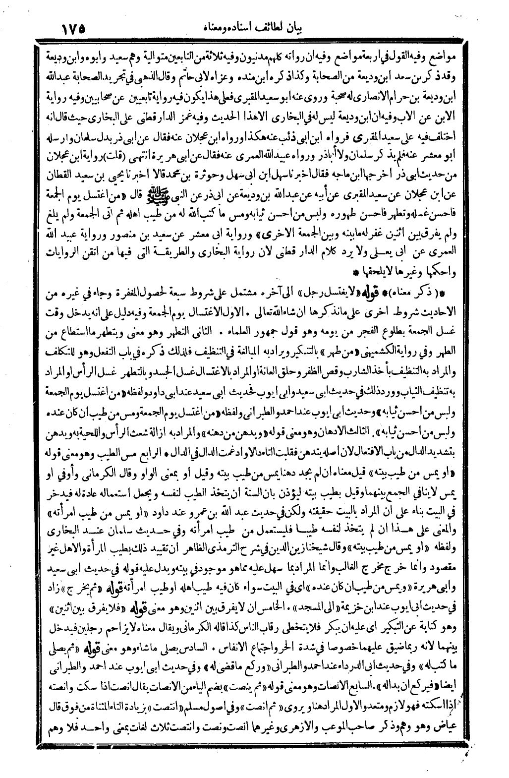 ذكر لطائف إِسْنَاده: فِيهِ: التحديث بِصِيغَة الْجمع فِي موضِعين. وَفِيه: الْإِخْبَار بِصِيغَة الْإِفْرَاد فِي مَوضِع. وَفِيه: العنعنة فِي ثَلَاثَة مَوَاضِع. وَفِيه: القَوْل فِي أَرْبَعَة مَوَاضِع. وَفِيه: أَن رُوَاته كلم مدنيون. وَفِيه: ثَلَاثَة من التَّابِعين مُتَوَالِيَة وهم: سعيد وَأَبوهُ وَابْن وَدِيعَة، وَقد ذكر ابْن سعد ابْن وَدِيعَة من الصَّحَابَة، وَكَذَا ذكره ابْن مَنْدَه، وَعَزاهُ لأبي حَاتِم. وَقَالَ الذَّهَبِيّ فِي (تَجْرِيد الصَّحَابَة) : عبد الله ابْن وَدِيعَة بن حرَام الْأنْصَارِيّ، لَهُ صُحْبَة، وروى عَنهُ أَبُو سعيد المَقْبُري، فعلى هَذَا يكون فِيهِ: رِوَايَة تابعيين عَن صحابيين. وَفِيه: رِوَايَة الابْن عَن الْأَب. وَفِيه: أَن ابْن وَدِيعَة لَيْسَ لَهُ فِي البُخَارِيّ إلاّ هَذَا الحَدِيث. وَفِيه: غمز الدَّارَقُطْنِيّ على البُخَارِيّ حَيْثُ قَالَ: إِنَّه اخْتلف فِيهِ على سعيد المَقْبُري، فَرَوَاهُ ابْن أبي ذِئْب عَنهُ هَكَذَا، وَرَوَاهُ ابْن عجلَان عَنهُ، فَقَالَ: عَن أبي ذَر، بدل سلمَان، وأرسله أَبُو معشر عَنهُ، فَلم يذكر سلمَان وَلَا أَبَا ذَر، وَرَوَاهُ عبيد الله الْعمريّ عَنهُ فَقَالَ: عَن أبي هُرَيْرَة. انْتهى. قلت: رِوَايَة ابْن عجلَان من حَدِيث أبي ذَر أخرجهَا ابْن مَاجَه فَقَالَ: أخبرنَا سهل بن أبي سهل وحوثرة بن مُحَمَّد قَالَا: أخبرنَا يحيى بن سعيد الْقطَّان عَن ابْن عجلَان عَن سعيد المَقْبُري عَن أَبِيه عَن عبد الله بن وَدِيعَة عَن أبي ذَر عَن النَّبِي صلى الله عَلَيْهِ وَسلم، قَالَ: (من اغْتسل يَوْم الْجُمُعَة فَأحْسن غسله، وتطهر فَأحْسن طهوره، وَلبس من أحسن ثِيَابه، وَمَسّ مَا كتب الله لَهُ من طيب أَهله، ثمَّ أَتَى الْجُمُعَة وَلم يلغ وَلم يفرق بَين اثْنَيْنِ غفر لَهُ مَا بَينه وَبَين الْجُمُعَة الْأُخْرَى) . وَرِوَايَة أبي معشر عَن سعيد بن مَنْصُور، وَرِوَايَة عبيد الله الْعمريّ عَن أبي يعلى، وَلَا يرد كَلَام الدَّارَقُطْنِيّ لِأَن رِوَايَة البُخَارِيّ والطريقة الَّتِي فِيهَا من اتقن الرِّوَايَات وأحكمها، وَغَيرهَا لَا يلْحقهَا.