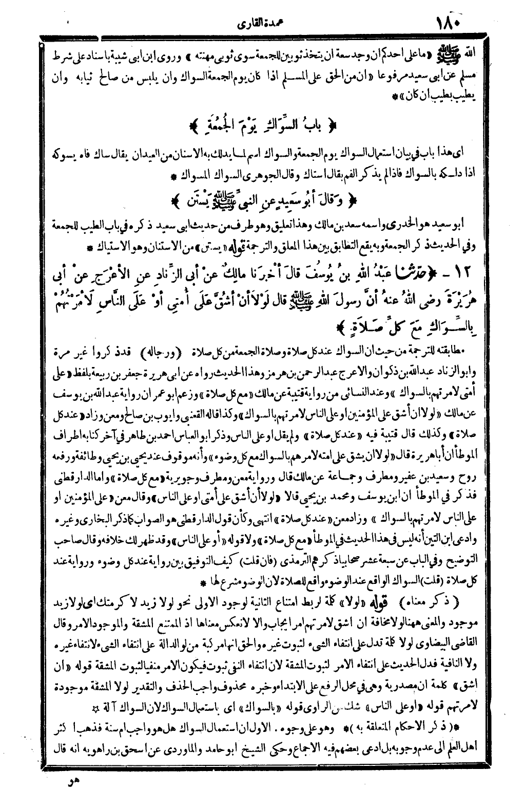 ذكر مَعْنَاهُ: قَوْله: (لَوْلَا) كلمة لربط امْتنَاع الثَّانِيَة لوُجُود الأولى، نَحْو: لَوْلَا زيد لأكرمتك، أَي: لَوْلَا زيد مَوْجُود، وَالْمعْنَى هَهُنَا، لَوْلَا مَخَافَة أَن أشق لأمرتهم أَمر إِيجَاب، وإلاّ لانعكس مَعْنَاهَا إِذْ الْمُمْتَنع: الْمَشَقَّة، وَالْمَوْجُود: الْأَمر. وَقَالَ القَاضِي الْبَيْضَاوِيّ: لَوْلَا، كلمة تدل على انْتِفَاء الشَّيْء لثُبُوت غَيره، وَالْحق أَنَّهَا مركبة من: لَو، الدَّالَّة على انْتِفَاء الشَّيْء لانْتِفَاء غَيره، و: لَا، النافية، فَدلَّ الحَدِيث على انْتِفَاء الْأَمر لثُبُوت الْمَشَقَّة، لِأَن انْتِفَاء النَّفْي ثُبُوت، فَيكون الْأَمر منفيا لثُبُوت الْمَشَقَّة. قَوْله: (أَن أشق) كلمة: أَن، مَصْدَرِيَّة، وَهِي مَحل الرّفْع على الِابْتِدَاء، وَخَبره مَحْذُوف وَاجِب الْحَذف، وَالتَّقْدِير: لَوْلَا الْمَشَقَّة مَوْجُودَة لأمرتهم. قَوْله: (أَو على النَّاس) ، شكّ من الرَّاوِي. قَوْله: (بِالسِّوَاكِ) أَي: بِاسْتِعْمَال السِّوَاك، لِأَن السِّوَاك آلَة.