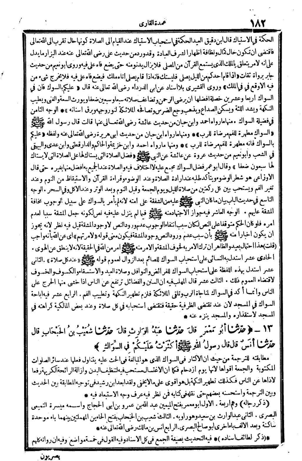 الثَّانِي عشر: اسْتدلَّ بِهَذِهِ اللَّفْظَة على اسْتِحْبَاب السِّوَاك للفرائض والنوافل وَصَلَاة الْعِيد وَالِاسْتِسْقَاء والكسوف والخسوف لاقْتِضَاء الْعُمُوم ذَلِك.