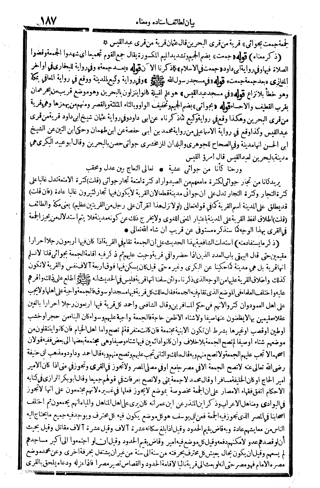 لجمعة جمعت بجواثى) ، قَرْيَة من قرى الْبَحْرين. قَالَ عُثْمَان: قَرْيَة من قرى عبد الْقَيْس.
