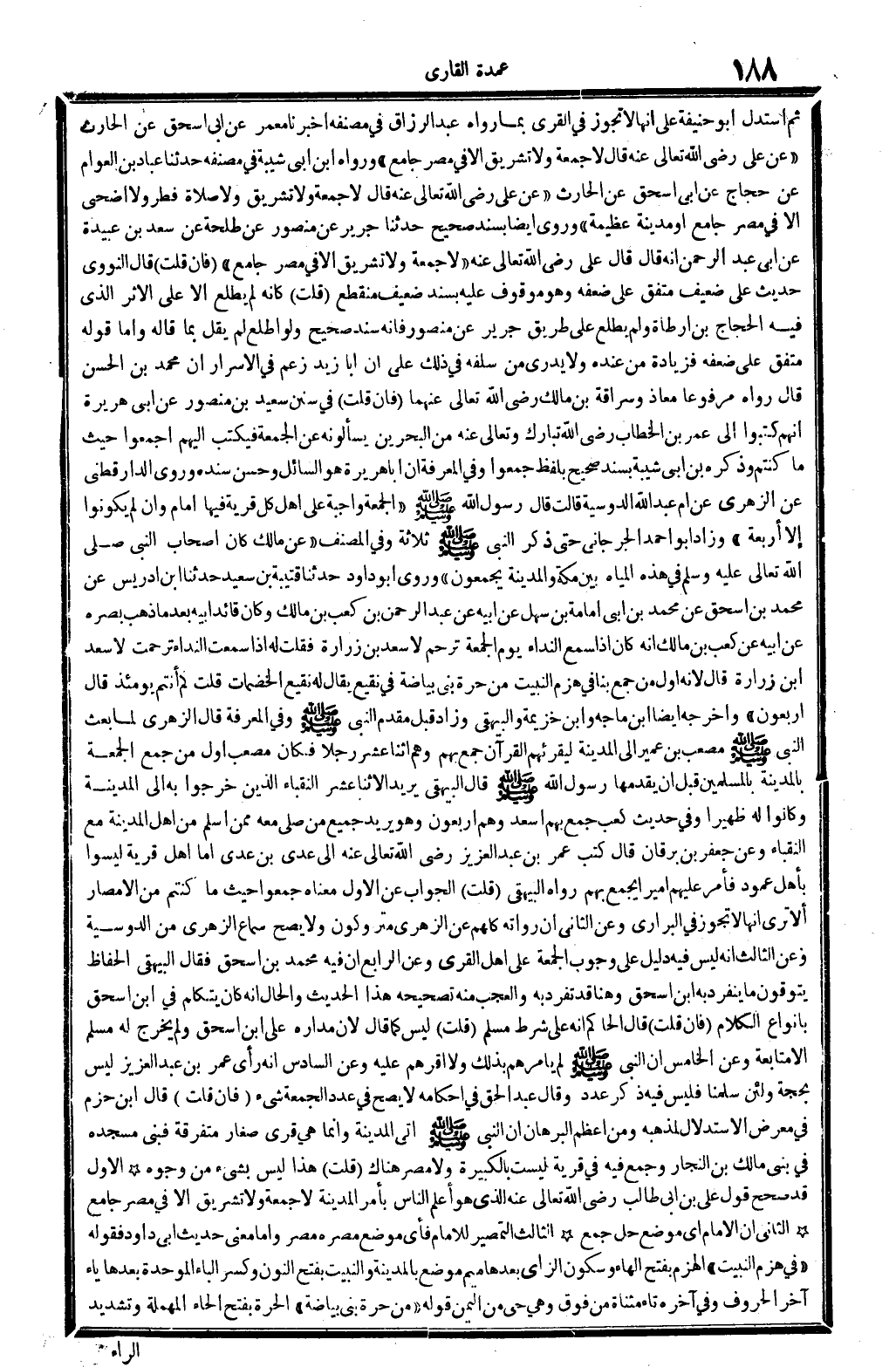 ثمَّ اسْتدلَّ أَبُو حنيفَة على أَنَّهَا لَا تجوز فِي الْقرى بِمَا رَوَاهُ عبد الرَّزَّاق فِي (مُصَنفه) ؛ أخبرنَا معمر عَن أبي إِسْحَاق عَن الْحَارِث (عَن عَليّ، رَضِي الله تَعَالَى عَنهُ، قَالَ: لَا جُمُعَة وَلَا تَشْرِيق إلاّ فِي مصر جَامع) ، وَرَوَاهُ ابْن أبي شيبَة فِي (مُصَنفه) : حَدثنَا عباد بن الْعَوام عَن حجاج عَن أبي إِسْحَاق عَن الْحَارِث، (عَن عَليّ، رَضِي الله تَعَالَى عَنهُ، قَالَ: لَا جُمُعَة وَلَا تَشْرِيق وَلَا صَلَاة فطر وَلَا أضحى إلاّ فِي مصر جَامع أَو مَدِينَة عَظِيمَة) ، وروى أَيْضا بِسَنَد صَحِيح: حَدثنَا جرير عَن مَنْصُور عَن طَلْحَة عَن سعد بن عُبَيْدَة عَن أبي عبد الرَّحْمَن أَنه قَالَ: قَالَ عَليّ، رَضِي الله تَعَالَى عَنهُ: (لَا جُمُعَة وَلَا تَشْرِيق إلاّ فِي مصر جَامع) . فَإِن قلت: قَالَ النَّوَوِيّ: حَدِيث عَليّ ضَعِيف مُتَّفق على ضعفه، وَهُوَ مَوْقُوف عَلَيْهِ بِسَنَد ضَعِيف مُنْقَطع؟ قلت: كَأَنَّهُ لم يطلع إلاّ على الْأَثر الَّذِي فِيهِ الْحجَّاج بن أَرْطَاة، وَلم يطلع على طَرِيق جرير عَن مَنْصُور، فَإِنَّهُ سَنَد صَحِيح، وَلَو اطلع لم يقل بِمَا قَالَه، وَأما قَوْله: مُتَّفق على ضعفه، فَزِيَادَة من عِنْده، وَلَا يدْرِي من سلفه فِي ذَلِك، على أَن أَبَا زيد زعم فِي (الْأَسْرَار) : أَن مُحَمَّد بن الْحسن قَالَ: رَوَاهُ مَرْفُوعا معَاذ وسراقة بن مَالك، رَضِي الله تَعَالَى عَنْهُمَا. فَإِن قلت: فِي (سنَن سعيد بن مَنْصُور) : عَن أبي هُرَيْرَة أَنهم كتبُوا إِلَى عمر بن الْخطاب، رَضِي الله تبَارك وَتَعَالَى عَنهُ، من الْبَحْرين يسألونه عَن الْجُمُعَة، فَيكْتب إِلَيْهِم: إجمعوا حَيْثُ مَا كُنْتُم. وَذكره ابْن أبي شيبَة بِسَنَد صَحِيح بِلَفْظ: جمعُوا، وَفِي (الْمعرفَة) أَن أَبَا هُرَيْرَة هُوَ السَّائِل، وَحسن سَنَده، وروى الدَّارَقُطْنِيّ عَن الزُّهْرِيّ، عَن أم عبد الله الدوسية، قَالَت: قَالَ رَسُول الله صلى الله عَلَيْهِ وَسلم: (الْجُمُعَة وَاجِبَة على أهل كل قَرْيَة فِيهَا إِمَام وَإِن لم يَكُونُوا إِلَّا أَرْبَعَة) . وَزَاد أَبُو أَحْمد الْجِرْجَانِيّ: حَتَّى ذكر النَّبِي صلى الله عَلَيْهِ وَسلم ثَلَاثَة، وَفِي (المُصَنّف) : (عَن مَالك: كَانَ أَصْحَاب النَّبِي، صلى الله عَلَيْهِ وَسلم، فِي هَذِه الْمِيَاه بَين مَكَّة وَالْمَدينَة يجمعُونَ) . وروى أَبُو دَاوُد: حَدثنَا قُتَيْبَة بن سعيد حَدثنَا ابْن إِدْرِيس عَن مُحَمَّد بن إِسْحَاق عَن مُحَمَّد بن أبي أُمَامَة بن سهل عَن أَبِيه عَن عبد الرَّحْمَن بن كَعْب بن مَالك، وَكَانَ قَائِد أَبِيه بَعْدَمَا ذهب بَصَره، عَن أَبِيه عَن كَعْب بن مَالك أَنه: كَانَ إِذا سمع النداء يَوْم الْجُمُعَة ترحم لأسعد بن زُرَارَة، فَقلت لَهُ: إِذا سَمِعت النداء ترحمت لأسعد ابْن زُرَارَة؟ قَالَ: لِأَن أول من جمع بِنَا فِي هزم النبيت من حرَّة بني بياضة فِي نَقِيع يُقَال لَهُ: نَقِيع الْخضمات، قلت: كم أَنْتُم يَوْمئِذٍ؟ قَالَ: أَرْبَعُونَ) . وَأخرجه أَيْضا ابْن مَاجَه وَابْن خُزَيْمَة وَالْبَيْهَقِيّ، وَزَاد: قبل مقدم النَّبِي صلى الله عَلَيْهِ وَسلم. وَفِي (الْمعرفَة) : قَالَ الزُّهْرِيّ: لما بعث النَّبِي صلى الله عَلَيْهِ وَسلم مُصعب بن عُمَيْر إِلَى الْمَدِينَة ليقرئهم الْقُرْآن جمع بهم وهم اثْنَا عشر رجلا، فَكَانَ مُصعب أول من جمع الْجُمُعَة بِالْمَدِينَةِ بِالْمُسْلِمين قبل أَن يقدمهَا رَسُول الله صلى الله عَلَيْهِ وَسلم. قَالَ الْبَيْهَقِيّ: يُرِيد الاثنا عشر النُّقَبَاء الَّذين خَرجُوا بِهِ إِلَى الْمَدِينَة وَكَانُوا لَهُ ظهيرا. وَفِي حَدِيث كَعْب: جمع بهم أسعد وهم أَرْبَعُونَ، وَهُوَ يُرِيد جَمِيع من صلى مَعَه مِمَّن أسلم من أهل الْمَدِينَة مَعَ النُّقَبَاء، وَعَن جَعْفَر بن برْقَان، قَالَ: كتب عمر بن عبد الْعَزِيز، رَضِي الله تَعَالَى عَنهُ، إِلَى عدي بن عدي. وَأما أهل قَرْ