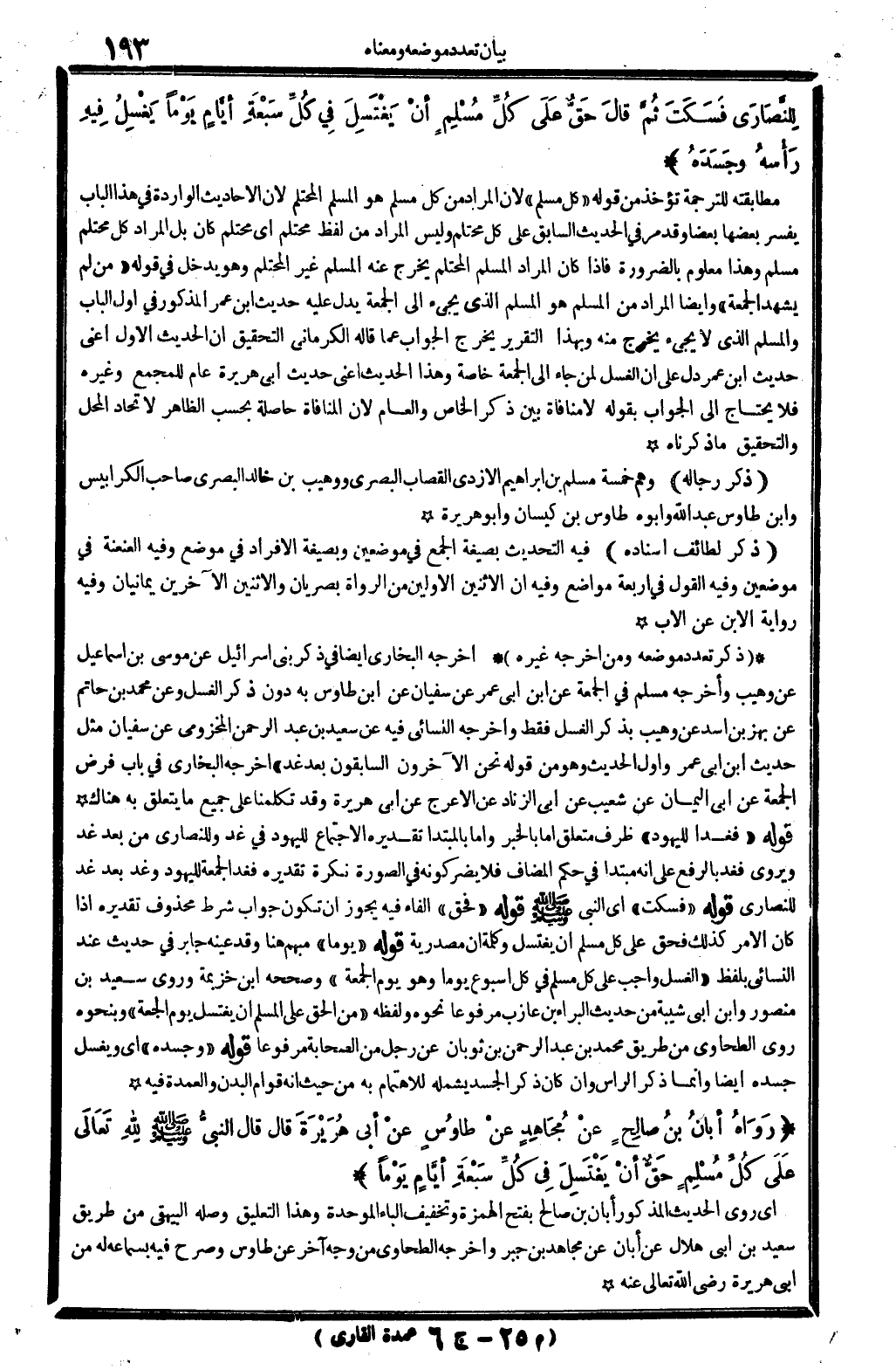 لِلنَّصَارَى فَسَكَتَ. ثمَّ قَالَ حق على كل مُسلم أَن يغْتَسل فِي كل سَبْعَة أَيَّام يَوْمًا يغسل فِيهِ رَأسه وَجَسَده) مطابقته للتَّرْجَمَة تُؤْخَذ من قَوْله " كل مُسلم " لِأَن المُرَاد من كل مُسلم هُوَ الْمُسلم المحتلم لِأَن الْأَحَادِيث الْوَارِدَة فِي هَذَا الْبَاب يُفَسر بَعْضهَا بَعْضًا وَقد مر فِي الحَدِيث السَّابِق على كل محتلم وَلَيْسَ المُرَاد من لفظ محتلم أَي محتلم كَانَ بل المُرَاد كل محتلم مُسلم وَهَذَا مَعْلُوم بِالضَّرُورَةِ فَإِذا كَانَ المُرَاد الْمُسلم المحتلم يخرج عَنهُ الْمُسلم غير المحتلم وَهُوَ يدْخل فِي قَوْله " من لم يشْهد الْجُمُعَة " وَأَيْضًا المُرَاد من الْمُسلم هُوَ الْمُسلم الَّذِي يَجِيء إِلَى الْجُمُعَة يدل عَلَيْهِ حَدِيث ابْن عمر الْمَذْكُور فِي أول الْبَاب وَالْمُسلم الَّذِي لَا يَجِيء يخرج مِنْهُ وَبِهَذَا التَّقْرِير يخرج الْجَواب عَمَّا قَالَه الْكرْمَانِي التَّحْقِيق أَن الحَدِيث الأول أَعنِي حَدِيث ابْن عمر دلّ على أَن الْغسْل لمن جَاءَ إِلَى الْجُمُعَة خَاصَّة وَهَذَا الحَدِيث أعنى حَدِيث أبي هُرَيْرَة عَام للمجمع وَغَيره فَلَا يحْتَاج إِلَى الْجَواب بقوله لَا مُنَافَاة بَين ذكر الْخَاص وَالْعَام لِأَن الْمُنَافَاة حَاصِلَة بِحَسب الظَّاهِر لِاتِّحَاد الْمحل وَالتَّحْقِيق مَا ذَكرْنَاهُ (ذكر رِجَاله) وهم خَمْسَة مُسلم بن إِبْرَاهِيم الْأَزْدِيّ القصاب الْبَصْرِيّ ووهيب بن خَالِد الْبَصْرِيّ صَاحب الكرابيس وَابْن طَاوس عبد الله وَأَبوهُ طَاوس بن كيسَان وَأَبُو هُرَيْرَة (ذكر لطائف إِسْنَاده) فِيهِ التحديث بِصِيغَة الْجمع فِي موضِعين وبصيغة الْإِفْرَاد فِي مَوضِع وَفِيه العنعنة فِي موضِعين وَفِيه القَوْل فِي أَرْبَعَة مَوَاضِع وَفِيه أَن الِاثْنَيْنِ الْأَوَّلين من الروَاة بصريان والاثنين الآخرين يمانيان وَفِيه رِوَايَة الابْن عَن الْأَب (ذكر تعدد مَوْضِعه وَمن أخرجه غَيره) أخرجه البُخَارِيّ أَيْضا فِي ذكر بني إِسْرَائِيل عَن مُوسَى بن إِسْمَاعِيل عَن وهيب وَأخرجه مُسلم فِي الْجُمُعَة عَن ابْن عمر عَن سُفْيَان عَن ابْن طَاوس بِهِ دون ذكر الْغسْل وَعَن مُحَمَّد بن حَاتِم عَن بهز بن أَسد عَن وهيب بِذكر الْغسْل فَقَط وَأخرجه النَّسَائِيّ فِيهِ عَن سعيد بن عبد الرَّحْمَن المَخْزُومِي عَن سُفْيَان مثل حَدِيث ابْن أبي عمر وَأول الحَدِيث وَهُوَ من قَوْله " نَحن الْآخرُونَ السَّابِقُونَ بعد غَد " أخرجه البُخَارِيّ فِي بَاب فرض الْجُمُعَة عَن أبي الْيَمَان عَن شُعَيْب عَن أبي الزِّنَاد عَن الْأَعْرَج عَن أبي هُرَيْرَة وَقد تكلمنا على جَمِيع مَا يتَعَلَّق بِهِ هُنَاكَ قَوْله " فغدا للْيَهُود " ظرف مُتَعَلق إِمَّا بالْخبر وَإِمَّا بالمبتدأ تَقْدِيره الِاجْتِمَاع للْيَهُود فِي غَد وَلِلنَّصَارَى من بعد غَد ويروى فغد بِالرَّفْع على أَنه مُبْتَدأ فِي حكم الْمُضَاف فَلَا يضر كَونه فِي الصُّورَة نكرَة تَقْدِيره فغد الْجُمُعَة للْيَهُود وغد بعد غَد لِلنَّصَارَى قَوْله " فَسكت " أَي النَّبِي - صَلَّى اللَّهُ عَلَيْهِ وَسَلَّم َ - قَوْله " فَحق " الْفَاء فِيهِ يجوز أَن تكون جَوَاب شَرط مَحْذُوف تَقْدِيره إِذا كَانَ الْأَمر كَذَلِك فَحق على كل مُسلم أَن يغْتَسل وَكلمَة أَن مَصْدَرِيَّة قَوْله " يَوْمًا " مُبْهَم هُنَا وَقد عينه جَابر فِي حَدِيث عِنْد النَّسَائِيّ بِلَفْظ " الْغسْل وَاجِب على كل مُسلم فِي كل أُسْبُوع يَوْمًا وَهُوَ يَوْم الْجُمُعَة " وَصَححهُ ابْن خُزَيْمَة وروى سعيد بن مَنْصُور وَابْن أبي شيبَة من حَدِيث الْبَراء بن عَازِب مَرْفُوعا نَحوه وَلَفظه " من الْحق على الْمُسلم أَن يغْتَسل يَوْم الْجُمُعَة " وبنحوه روى الطَّحَاوِيّ من طَرِيق مُحَمَّد بن عبد الرَّحْمَن بن ثَوْبَان عَن رجل من الصَّحَابَة مَرْفُوعا قَوْله " وَجَسَده " أَي وَيغسل جسده أَيْضا وَإِنَّمَا ذكر الرَّأْس