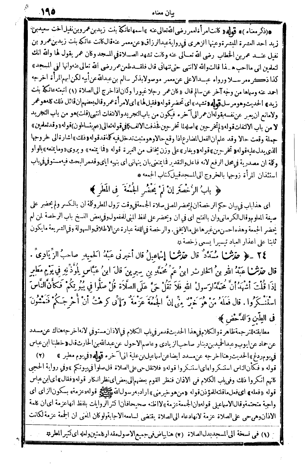 901 - حدَّثنا مُسَدَّدٌ قَالَ حدَّثنا إسْمَاعِيلُ قَالَ أَخْبرنِي عَبْدُ الحَمِيدِ صاحبُ الزِّيادِيِّ. قَالَ حدَّثنا عَبْدُ الله بنُ الحَارِثِ ابنُ عَمِّ مُحَمَّدِ بنِ سِيرِينَ قالَ ابنُ عَبَّاسٍ لِمُؤَذِّنِهِ فِي يَوْمٍ مَطِيرٍ إذَا قُلْتُ أشْهَدُ أنَّ مُحَمَّدا رَسُولَ الله فَلاَ تَقُلْ حَيَّ عَلَى الصَّلاَةِ قُلْ صَلُّوا فِي بُيُوتِكُمْ فكأنَّ النَّاسَ اسْتَنْكَرُوا. قَالَ فَعَلَهُ مَنْ هُوَ خَيْرٌ مِنِّي إنَّ الجُمُعَةَ عَزْمَةٌ وَإنِّي كرهْتُ أنْ أُحْرِجَكُمْ فَتَمْشُونَ فِي الطِّينِ وَالدَّحْضِ. (انْظُر الحَدِيث 616 وطرفه) .