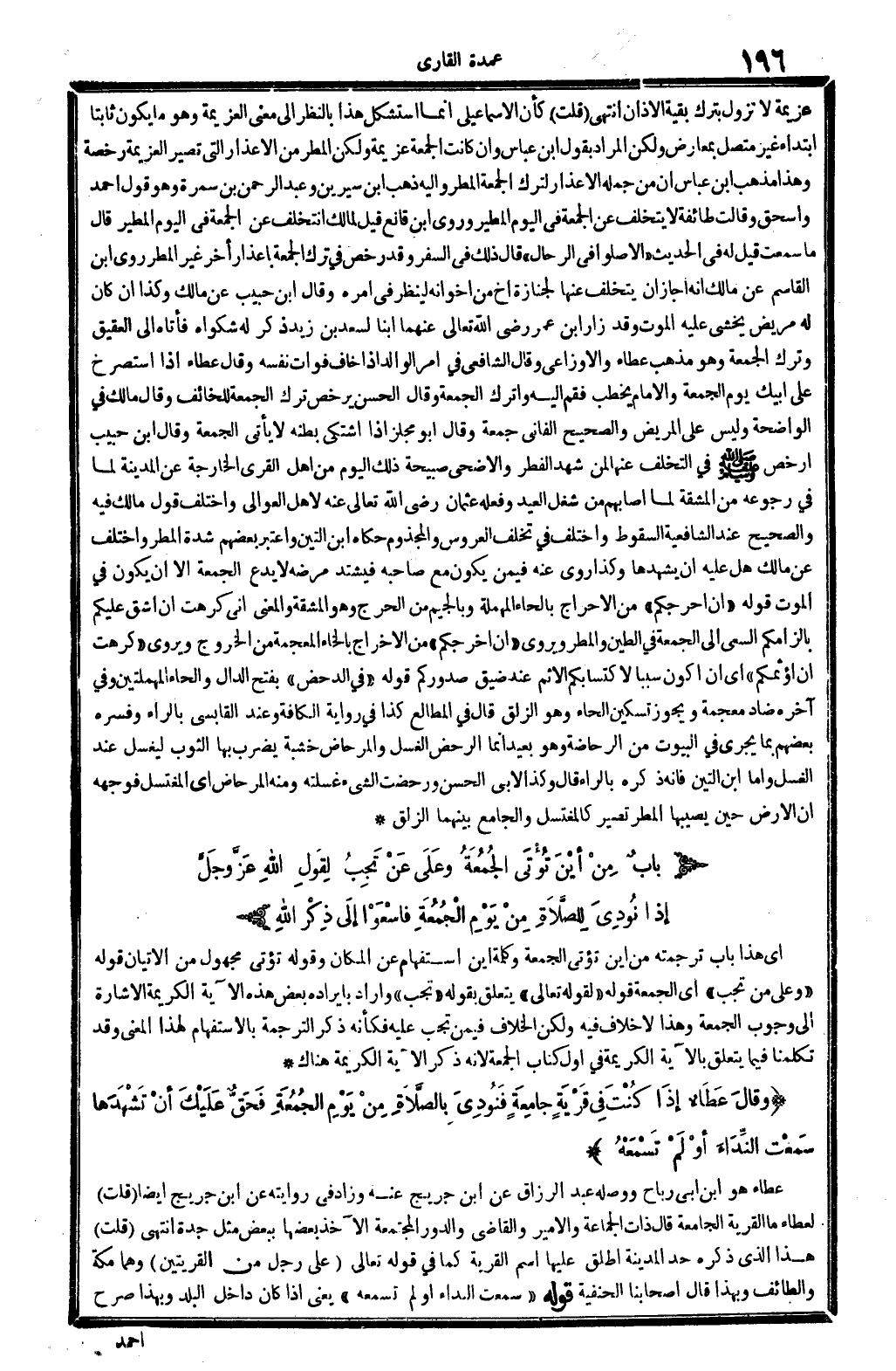 عَطاء هُوَ: ابْن أبي رَبَاح، وَوَصله عبد الرَّزَّاق عَن ابْن جريج عَنهُ، وَزَاد فِي رِوَايَته: عَن ابْن جريج أَيْضا قلت لعطاء: مَا الْقرْيَة الجامعة؟ قَالَ: ذَات الْجَمَاعَة والأمير وَالْقَاضِي والدور المجتمعة الْآخِذ بَعْضهَا بِبَعْض، مثل جدة. انْتهى. قلت: هَذَا الَّذِي ذكره حد الْمَدِينَة أطلق عَلَيْهَا اسْم الْقرْيَة. كَمَا فِي قَوْله تَعَالَى: على رجل من القريتين} (الزخرف: 31) . وهما: مَكَّة والطائف، وَبِهَذَا قَالَ أَصْحَابنَا الْحَنَفِيَّة. قَوْله: (سَمِعت النداء أَو لم تسمعه) يَعْنِي: إِذا كَانَ دَاخل الْبَلَد، وَبِهَذَا صرح