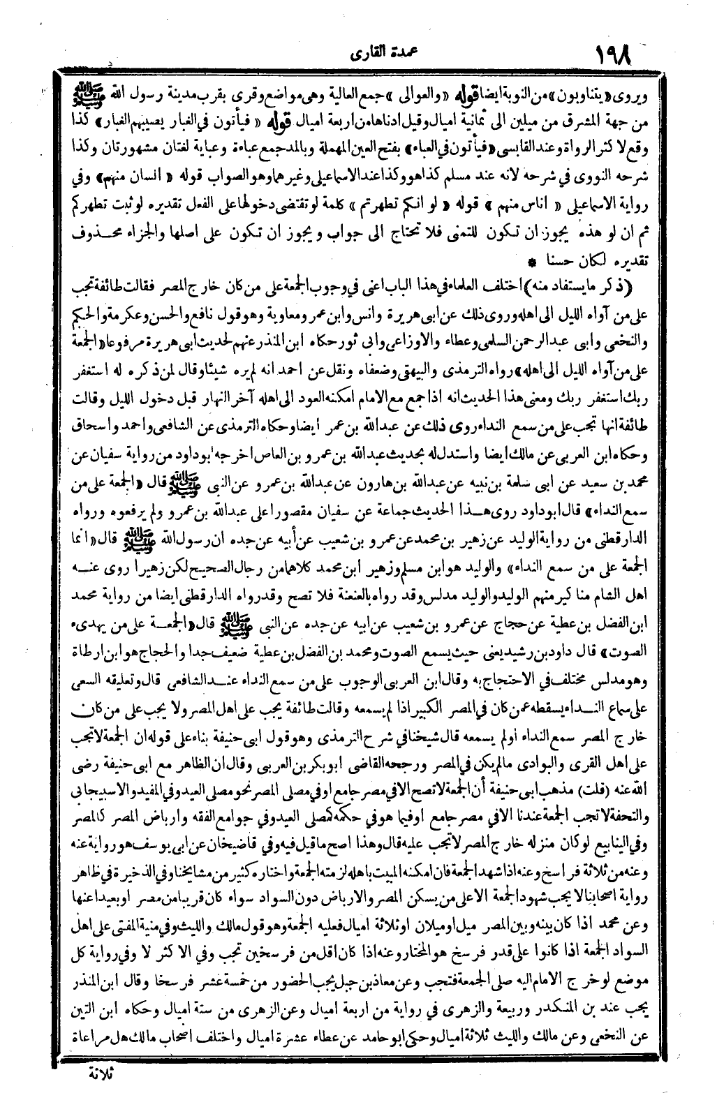 ذكر مَا يُسْتَفَاد مِنْهُ اخْتلف الْعلمَاء فِي هَذَا الْبَاب أَعنِي: فِي وجوب الْجُمُعَة على من كَانَ خَارج الْمصر فَقَالَت طَائِفَة: تحب على من آواه اللَّيْل إِلَى أَهله، وَرُوِيَ ذَلِك عَن أبي هُرَيْرَة وَأنس وَابْن عمر وَمُعَاوِيَة، وَهُوَ قَول نَافِع وَالْحسن وَعِكْرِمَة وَالْحكم وَالنَّخَعِيّ وَأبي عبد الرَّحْمَن السّلمِيّ وَعَطَاء وَالْأَوْزَاعِيّ وَأبي ثَوْر، حَكَاهُ ابْن الْمُنْذر عَنْهُم لحَدِيث أبي هُرَيْرَة مَرْفُوعا: (الْجُمُعَة على من آواه اللَّيْل إِلَى أَهله) ، رَوَاهُ التِّرْمِذِيّ وَالْبَيْهَقِيّ وضعفاه، وَنقل عَن أَحْمد أَنه لم يره شَيْئا، وَقَالَ لمن ذكره لَهُ: اسْتغْفر رَبك اسْتغْفر رَبك، وَمعنى هَذَا الحَدِيث: أَنه إِذا جمع مَعَ الإِمَام أمكنه الْعود إِلَى أَهله آخر النَّهَار قبل دُخُول اللَّيْل. وَقَالَت طَائِفَة: إِنَّهَا تجب على من سمع النداء، رُوِيَ ذَلِك عَن عبد الله بن عمر أَيْضا وَحَكَاهُ التِّرْمِذِيّ عَن الشَّافِعِي وَأحمد وَإِسْحَاق، وَحَكَاهُ ابْن الْعَرَبِيّ عَن مَالك أَيْضا وَاسْتدلَّ لَهُ بِحَدِيث عبد الله بن عَمْرو بن الْعَاصِ أخرجه أَبُو دَاوُد من رِوَايَة سُفْيَان عَن مُحَمَّد بن سعيد عَن أبي سَلمَة بن نبيه عَن عبد الله بن هَارُون عَن عبد الله بن عَمْرو عَن النَّبِي صلى الله عَلَيْهِ وَسلم: قَالَ: (الْجُمُعَة على من سمع النداء) . قَالَ أَبُو دَاوُد: روى هَذَا الحَدِيث جمَاعَة عَن سُفْيَان مَقْصُورا على عبد الله بن عَمْرو، وَلم يرفعوه. وَرَوَاهُ الدَّارَقُطْنِيّ من رِوَايَة الْوَلِيد عَن زُهَيْر بن مُحَمَّد عَن عَمْرو بن شُعَيْب عَن أَبِيه عَن جده: أَن رَسُول الله صلى الله عَلَيْهِ وَسلم قَالَ: (إِنَّمَا الْجُمُعَة على من سمع النداء) ، والوليد هُوَ ابْن مُسلم، وَزُهَيْر ابْن مُحَمَّد، كِلَاهُمَا من رجال (الصَّحِيح) . لَكِن زهيرا روى عَنهُ أهل الشَّام مَنَاكِير، مِنْهُم: الْوَلِيد والوليد مُدَلّس، وَقد رَوَاهُ بالعنعنة فَلَا تصح، وَقد رَوَاهُ الدَّارَقُطْنِيّ أَيْضا من رِوَايَة مُحَمَّد ابْن الْفضل بن عَطِيَّة عَن حجاج عَن عَمْرو بن شُعَيْب عَن أَبِيه عَن جده عَن النَّبِي صلى الله عَلَيْهِ وَسلم، قَالَ: (وَالْجُمُعَة على من يهدىء الصَّوْت) . قَالَ دَاوُد بن رشيد: يَعْنِي حَيْثُ يسمع الصَّوْت، وَمُحَمّد بن الْفضل بن عَطِيَّة ضَعِيف جدا، وَالْحجاج هُوَ: ابْن أَرْطَأَة، وَهُوَ مُدَلّس مُخْتَلف فِي الِاحْتِجَاج بِهِ، وَقَالَ ابْن الْعَرَبِيّ: الْوُجُوب على من سمع النداء عِنْد الشَّافِعِي، قَالَ: وتعليقه السَّعْي على سَماع النداء يسْقطهُ عَمَّن كَانَ فِي الْمصر الْكَبِير إِذا لم يسمعهُ، وَقَالَت طَائِفَة: يجب على أهل الْمصر، وَلَا يجب على من كَانَ خَارج الْمصر، سمع النداء أَو لم يسمعهُ. قَالَ شَيخنَا فِي (شرح التِّرْمِذِيّ) : وَهُوَ قَول أبي حنيفَة بِنَاء على قَوْله: إِن الْجُمُعَة لَا تجب على أهل الْقرى والبوادي مَا لم يكن فِي الْمصر، وَرجحه القَاضِي أَبُو بكر بن الْعَرَبِيّ، وَقَالَ: إِن الظَّاهِر مَعَ أبي حنيفَة، رَضِي الله تَعَالَى عَنهُ. قلت: مَذْهَب أبي حنيفَة: أَن الْجُمُعَة لَا تصح إلاّ فِي مصر جَامع، أَو فِي مصلى الْمصر نَحْو مصلى الْعِيد. وَفِي (الْمُفِيد) و (الاسبيجابي) و (التُّحْفَة) : لَا تجب الْجُمُعَة عندنَا إلاّ فِي مصر جَامع، أَو فِيمَا هُوَ فِي حكمه، كمصلى الْعِيد. وَفِي (جَوَامِع الْفِقْه) : وأرباض الْمصر كالمصر، وَفِي (الْيَنَابِيع) : لَو كَانَ منزله خَارج الْمصر لَا تجب عَلَيْهِ. قَالَ: وَهَذَا أصح مَا قيل فِيهِ، وَفِي (قاضيخان) : عَن أبي يُوسُف هُوَ رِوَايَة عَنهُ، وَعنهُ من ثَلَاثَة فراسخ، وَعنهُ إِذا شهد الْجُمُعَة فَإِن أمكنه الْمبيت بأَهْله لَزِمته الْجُمُعَة، وَاخْتَارَهُ كثير من مَشَايِخنَا. وَفِي (الذَّخِيرَة) : فِي ظَاهر رِوَايَة أَصْحَابنَا: لَا يجب شُهُود الْجُمُ